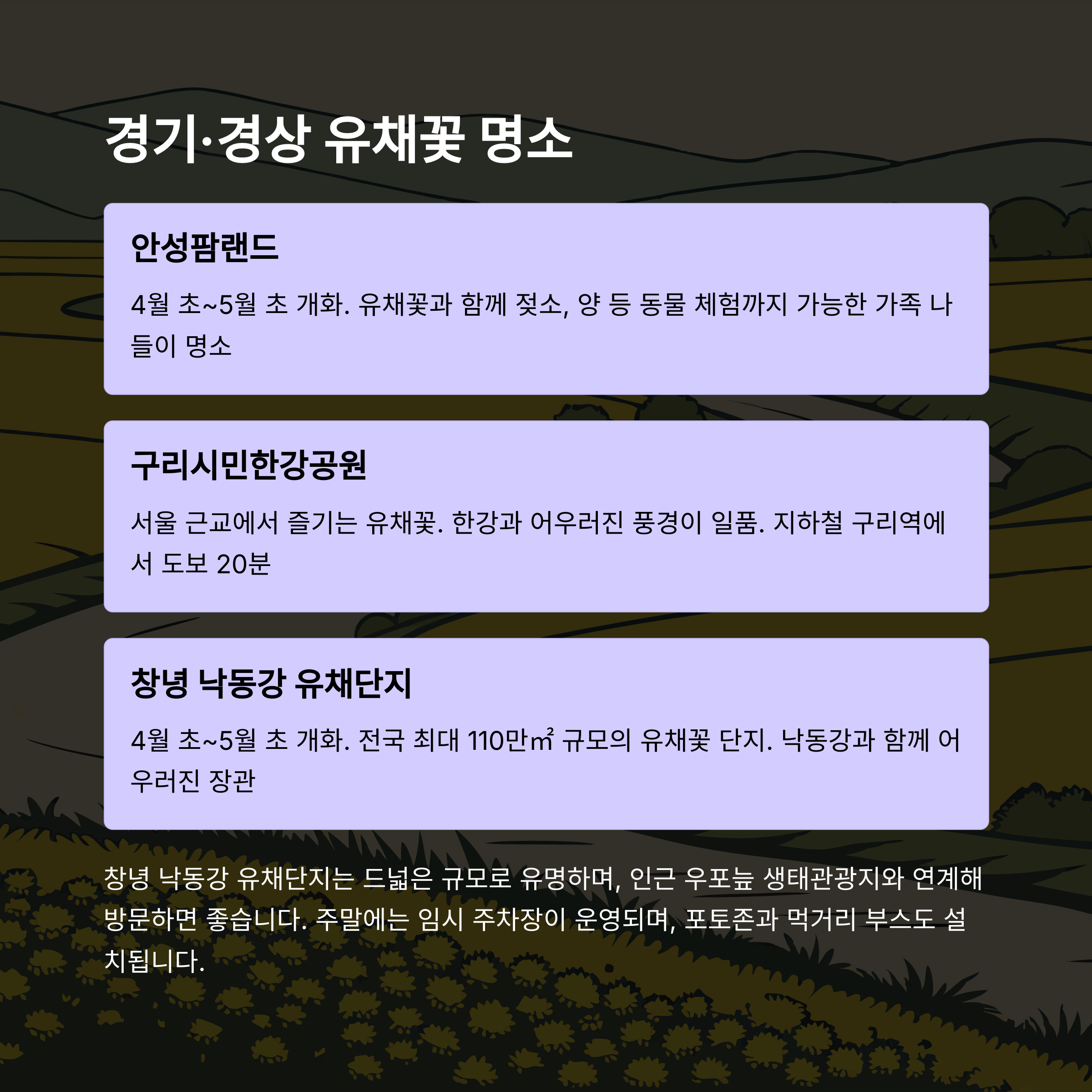 - 특징: 서울 근교에서 즐기는 유채꽃 나들이 명소