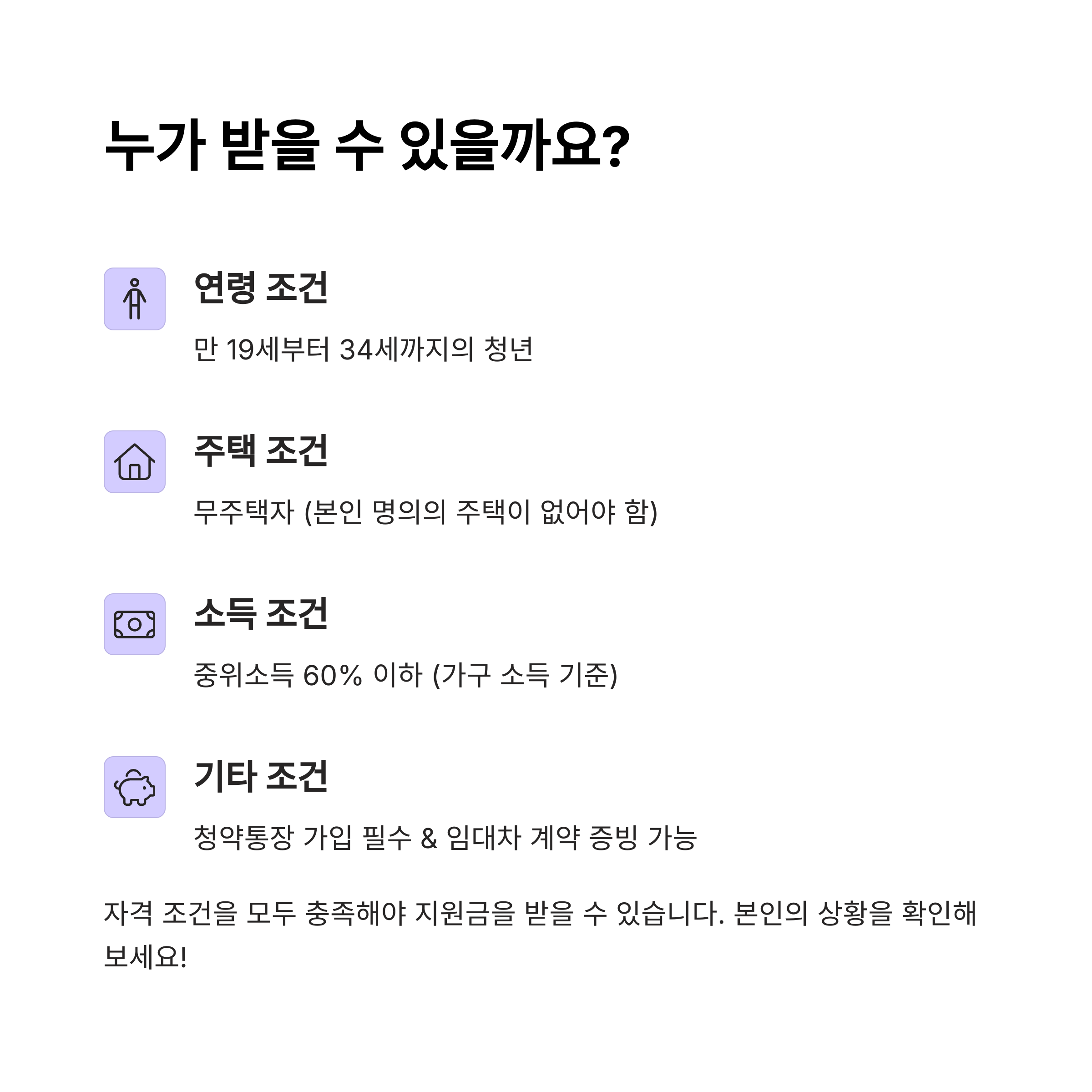 - 청년가구 소득: 중위소득 60% 이하 (1인 기준 약 143만 원)