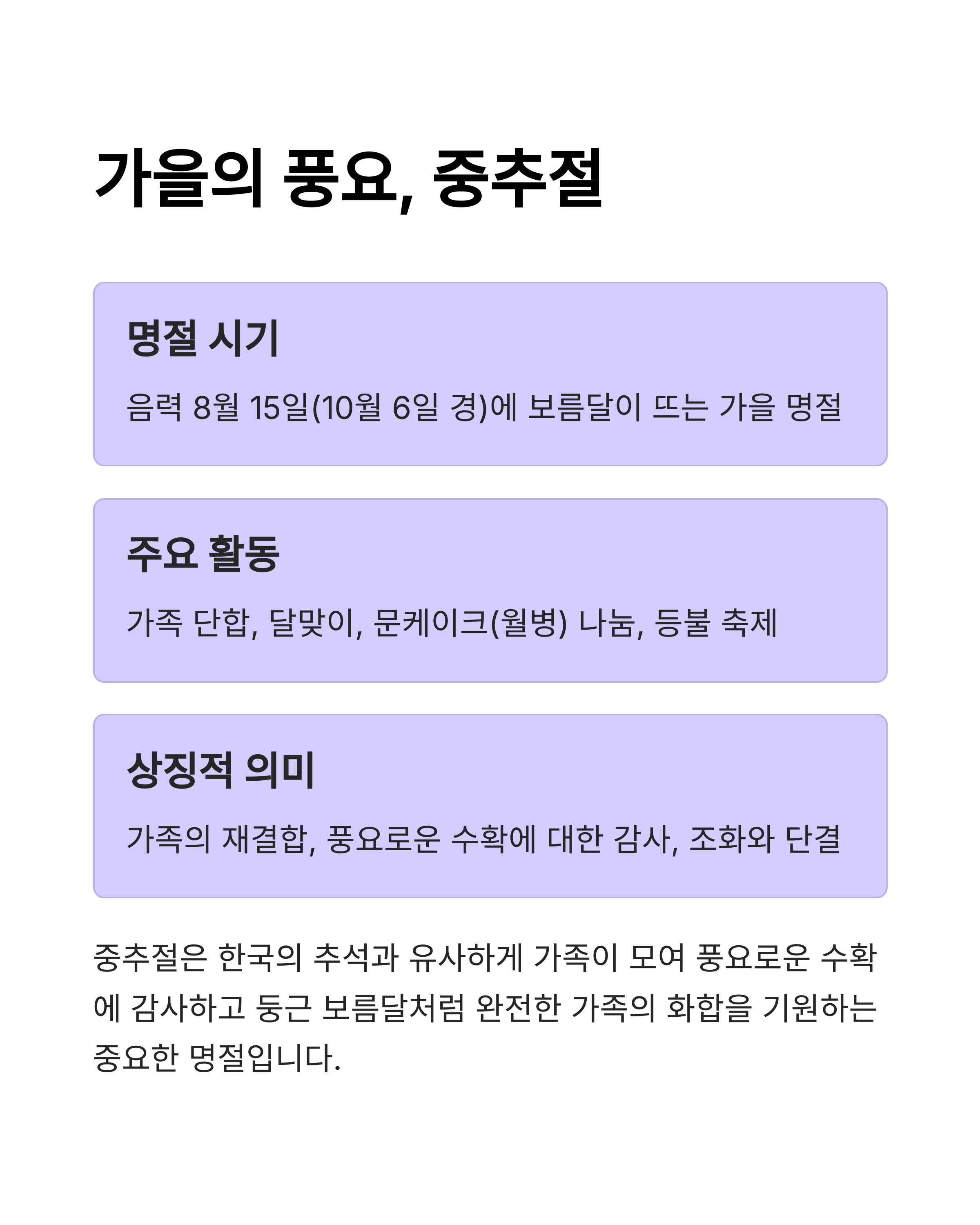 | 중추절 | 10월 6일 | 달맞이, 문케이크 나눔 | 최대 8일 연휴 |