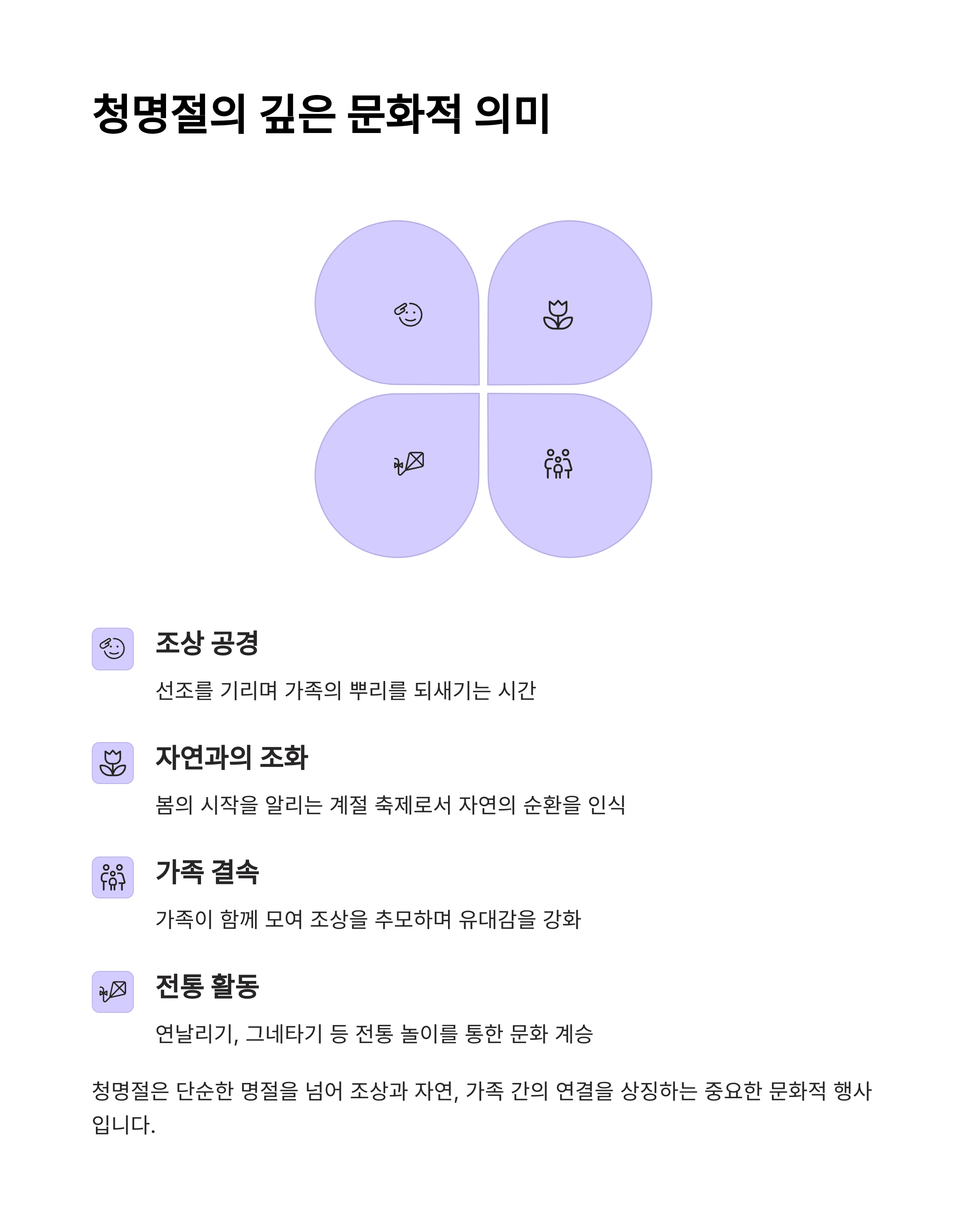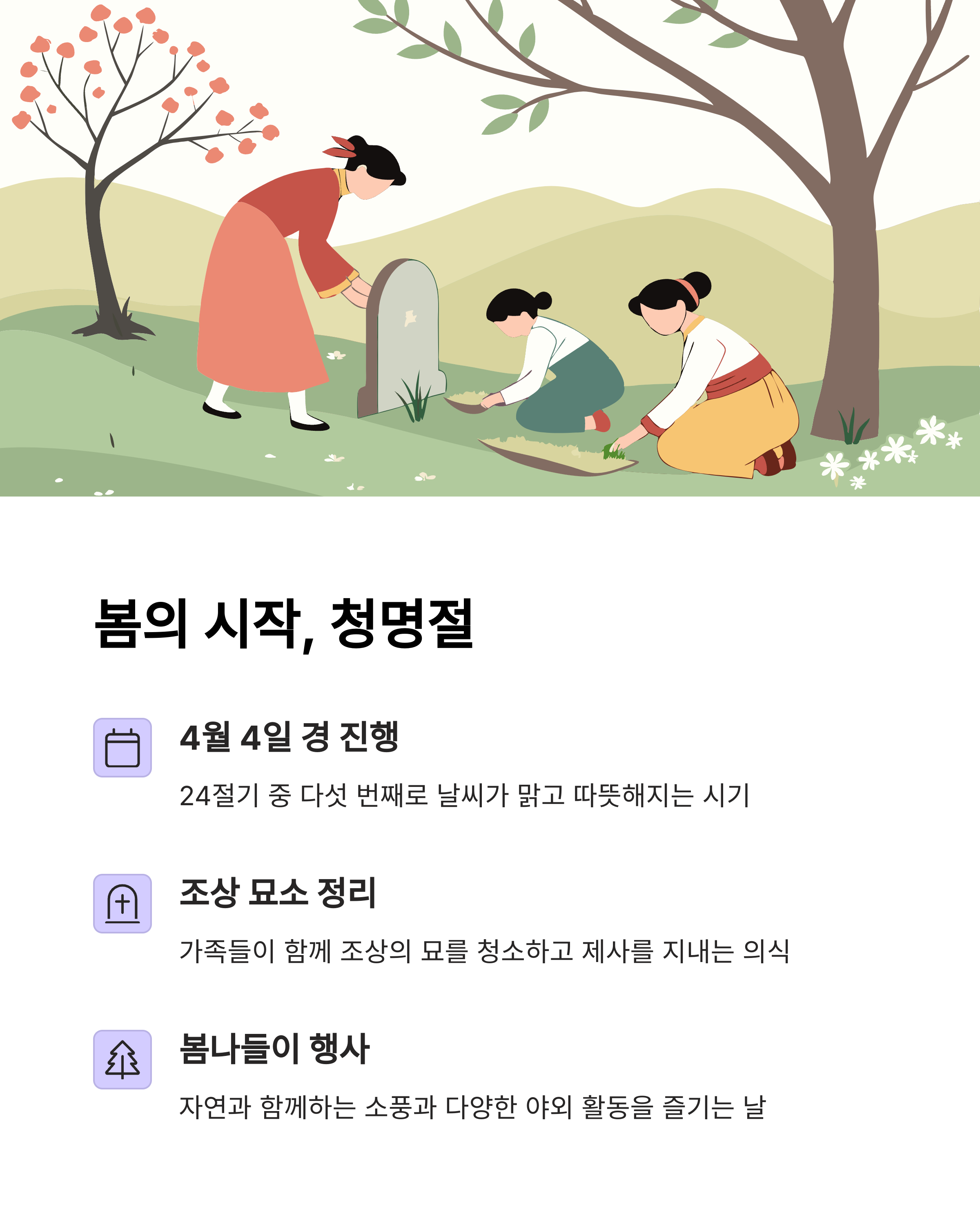 | 청명절 | 4월 4일 | 묘소 청소, 봄 나들이 | 3일 연휴 |