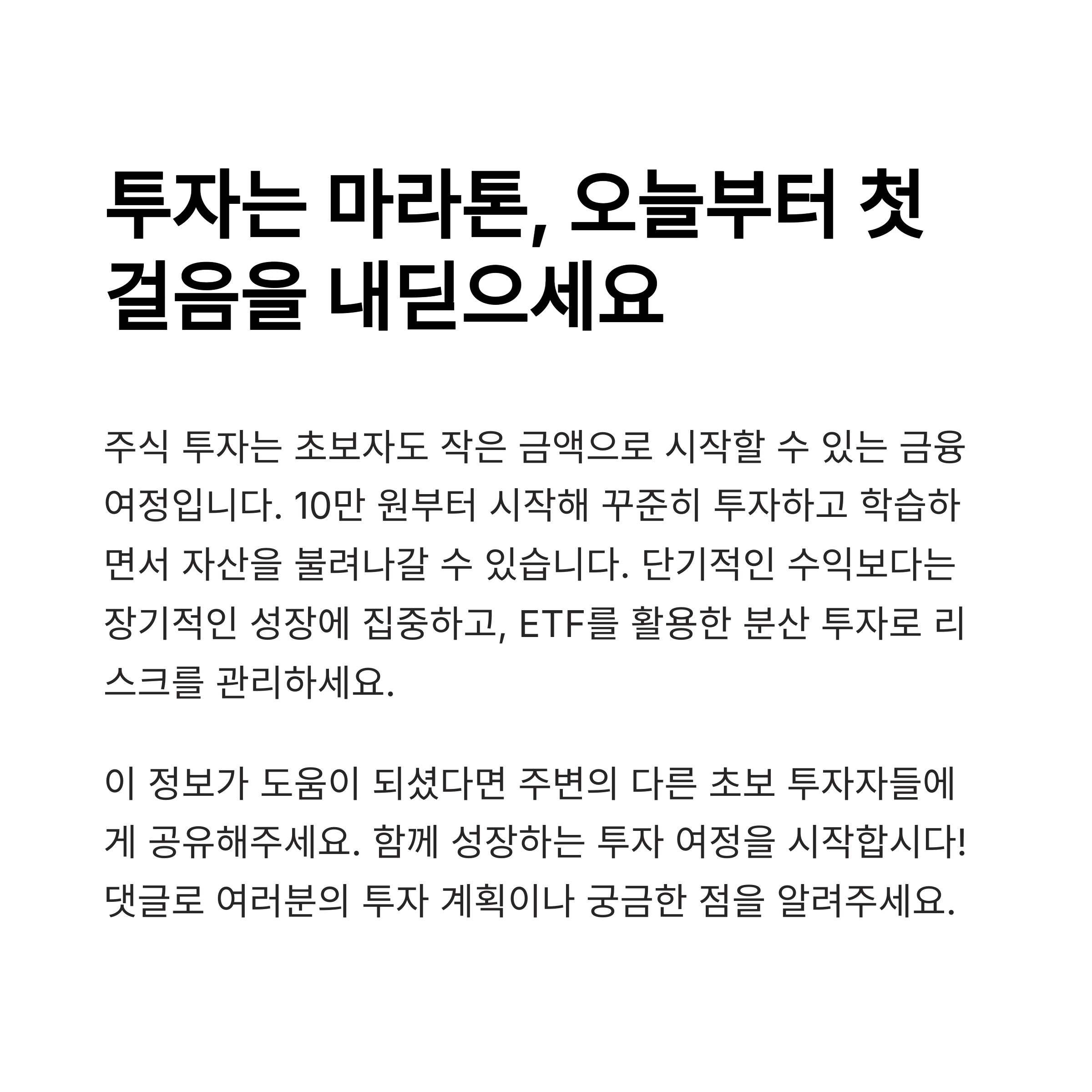초보일수록 단타보다 장기 투자에 집중하세요. ETF 자동적립식 투자처럼 장기 관점에서 평균 매수가를 낮추는 방식이 심리적으로도 훨씬 편합니다.