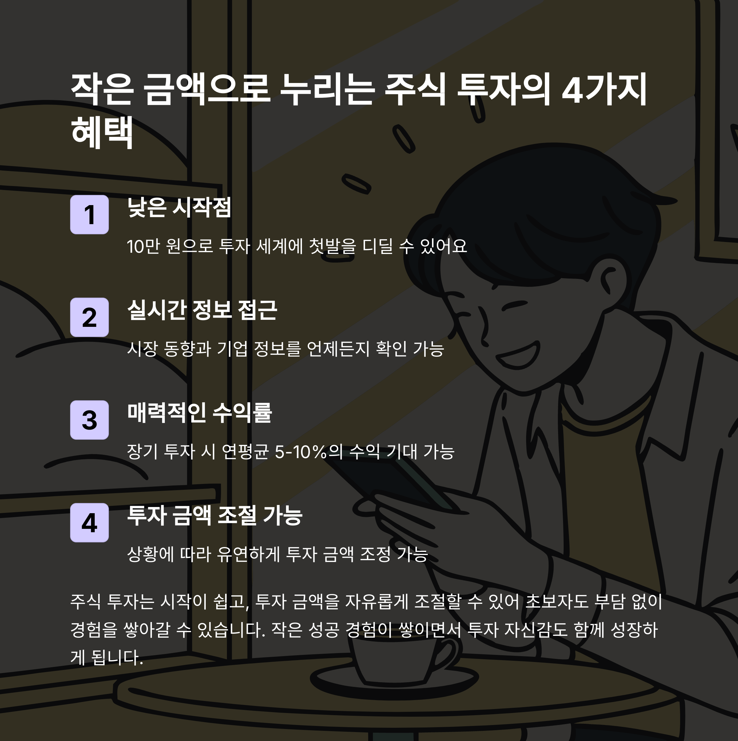 - 최소 투자 금액: 주식은 1만 원 이하로 시작 가능, 부동산은 최소 수천만 원 필요