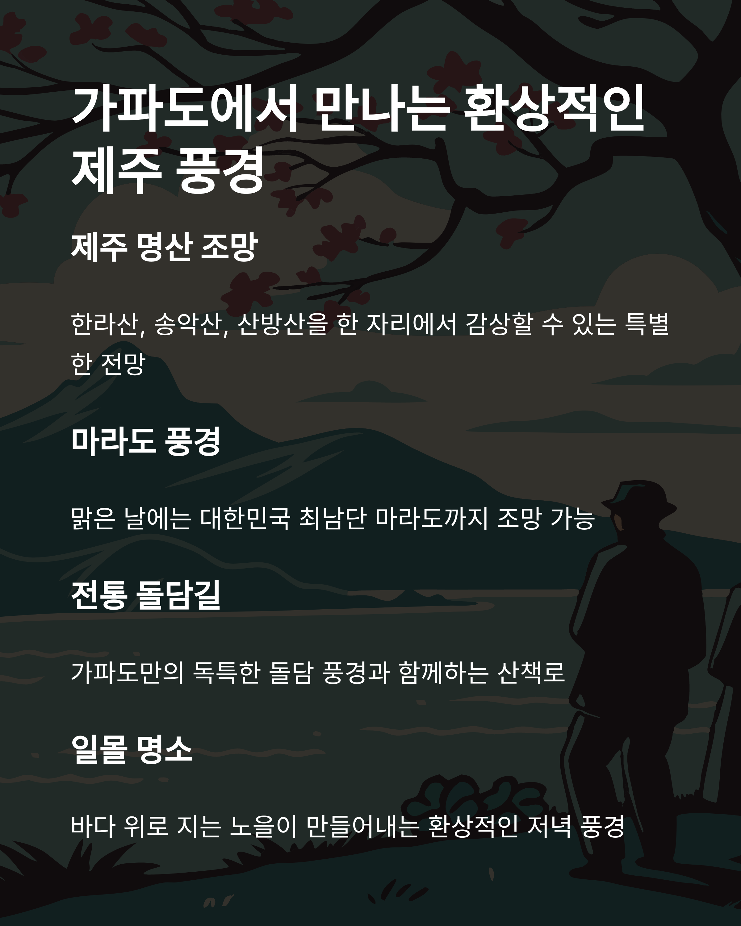가파도의 가장 큰 매력은 청보리밭과 바다가 만들어내는 절경입니다. 약 60만㎡의 넓이를 자랑하는 청보리밭은 바람에 따라 파도처럼 흔들리며, 그 모습은 마치 자연이 그려낸 그림과 같습니다. 또한 한라산, 송악산, 산방산 등 제주 본섬의 주요 산들이 가파도를 둘러싸고 있어, 이곳에서 바라보는 풍경은 그야말로 장관입니다.