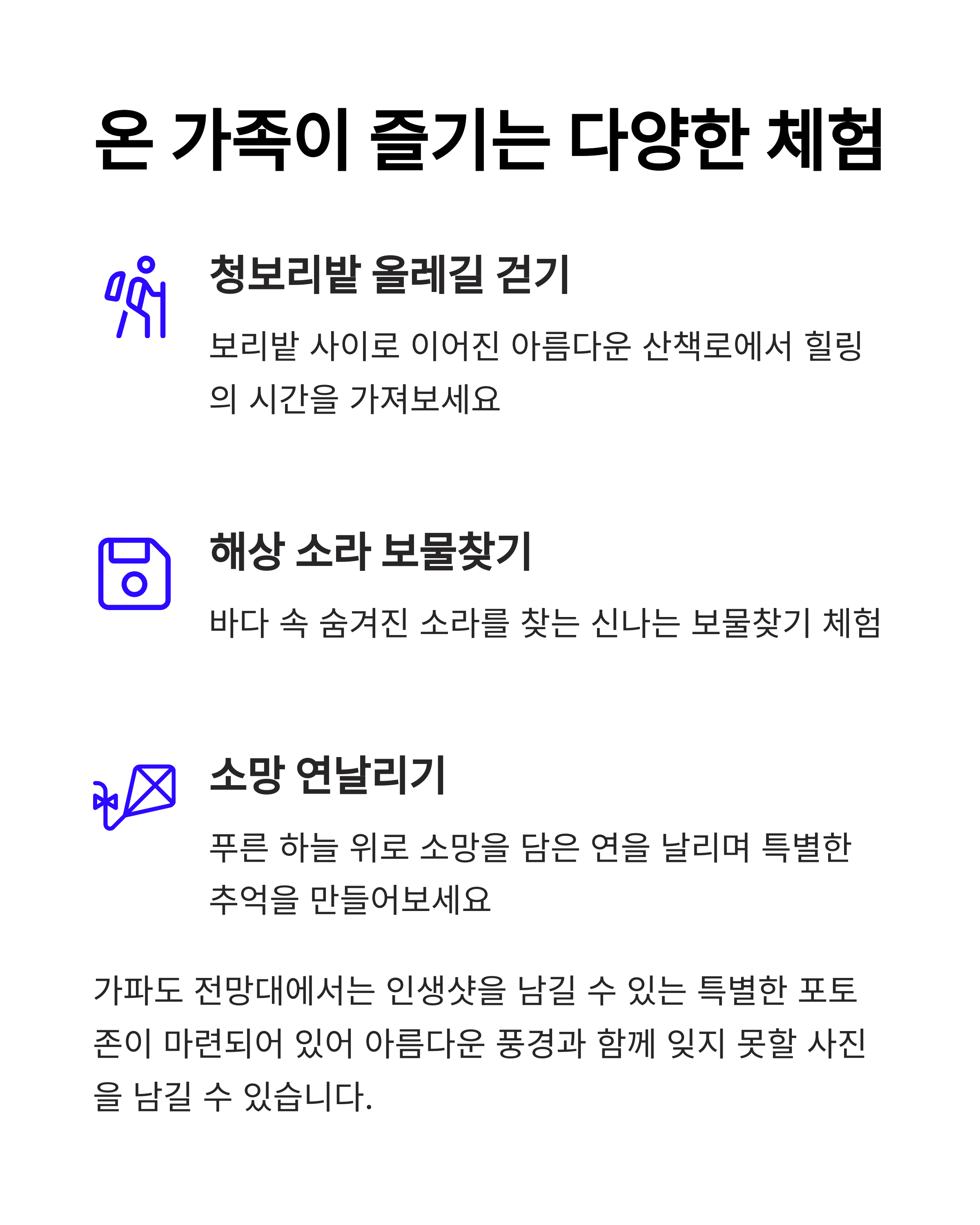 | 편안한 신발 착용 | 청보리밭과 올레길을 걷기 위해서는 편안한 신발을 준비하는 것이 좋습니다. |