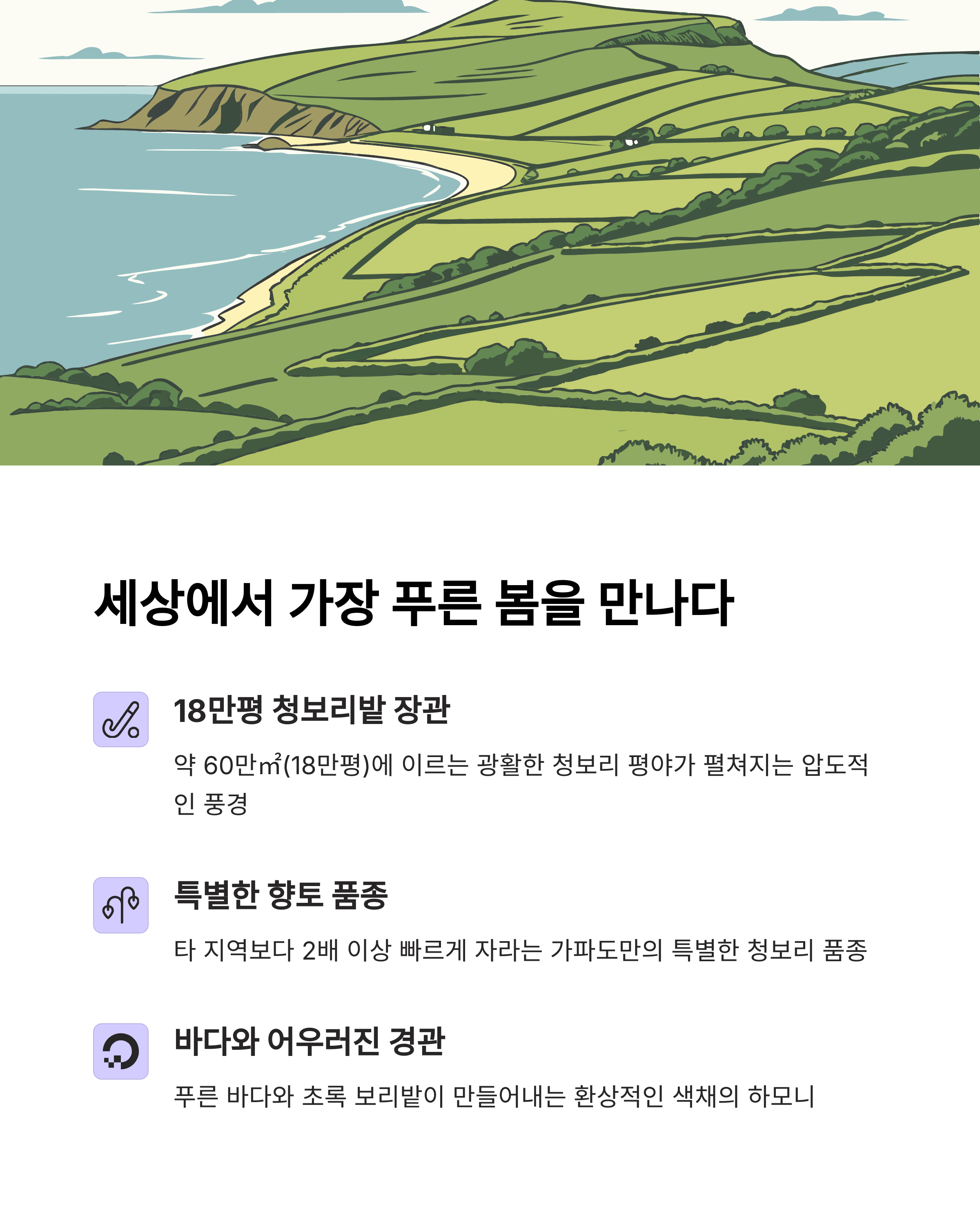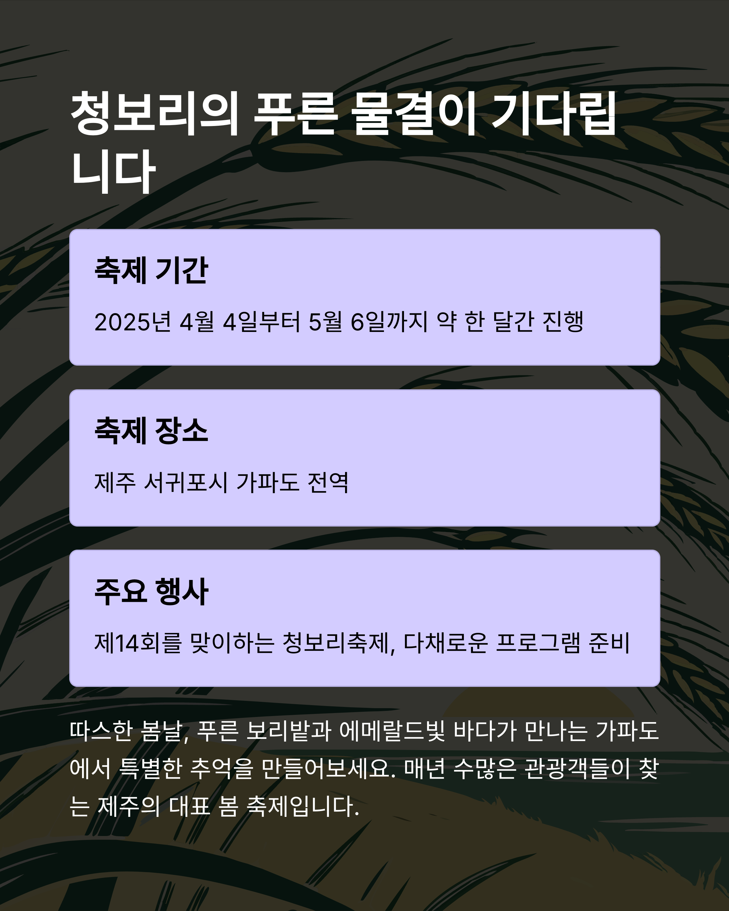 안녕하세요! 오늘은 제주 가파도에서 열리는 청보리축제에 대해 소개해드릴게요. 이 축제는 단순한 봄 축제가 아니라, 바다와 보리밭이 어우러지는 아름다운 풍경 속에서 힐링할 수 있는 기회를 제공합니다. 함께 떠날 준비 되셨나요?