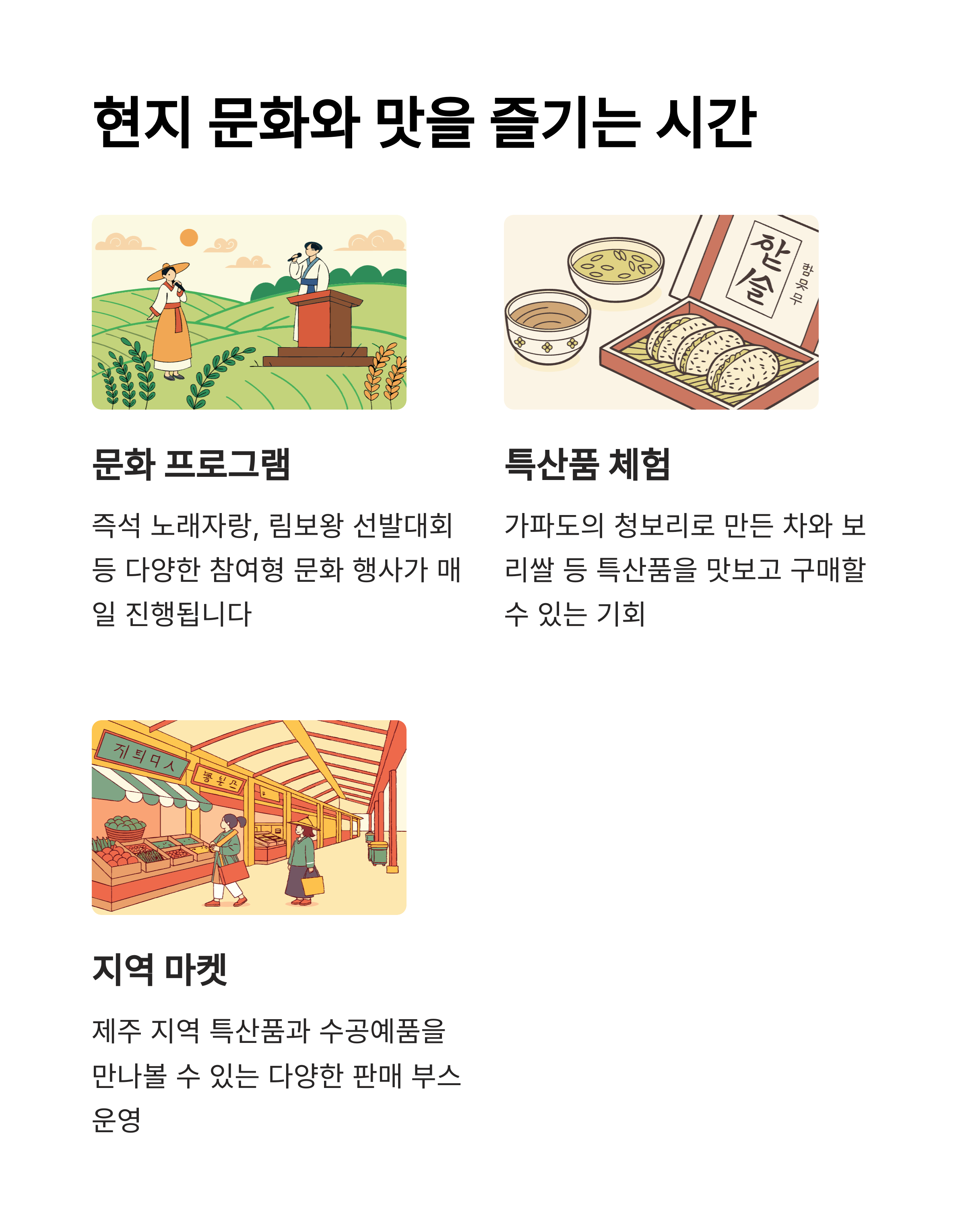 - 다양한 체험 프로그램과 지역 특산품도 함께 즐길 수 있음
