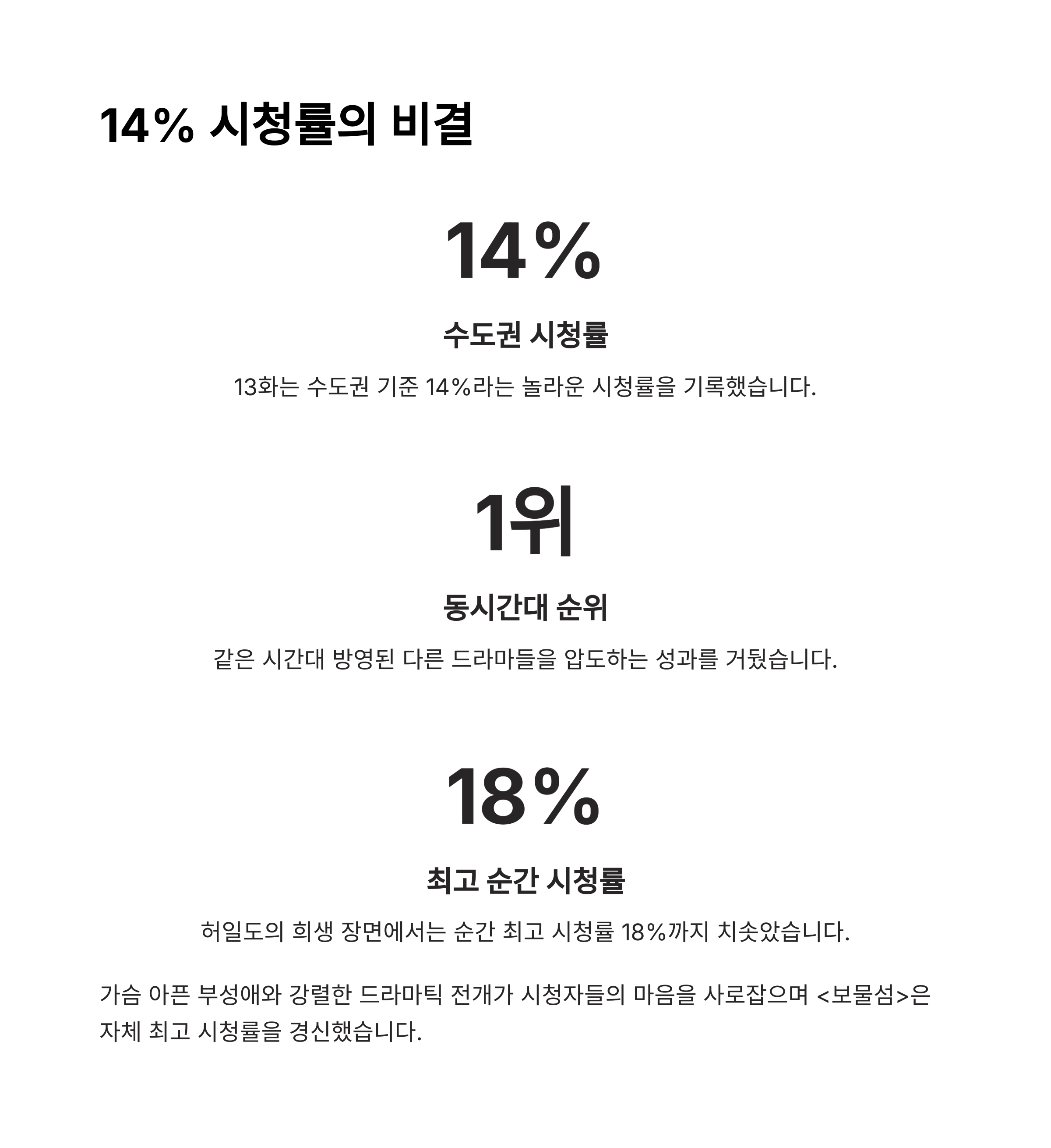 ‘보물섬’ 13화는 방송 직후 엄청난 반향을 일으켰습니다. 수도권 14%, 전국 13.4%라는 시청률을 기록하며 자체 최고치를 경신했죠. 순간 최고 시청률은 무려 15.7%까지 치솟았고, 특히 2049 타깃 시청률에서는 동 시간대 1위를 차지하는 쾌거를 이뤘습니다. 실시간 커뮤니티에서도 ‘눈물 없이 못 본 회차’, ‘허일도… 지금도 잊지 못해’라는 댓글이 넘쳐났어요.
