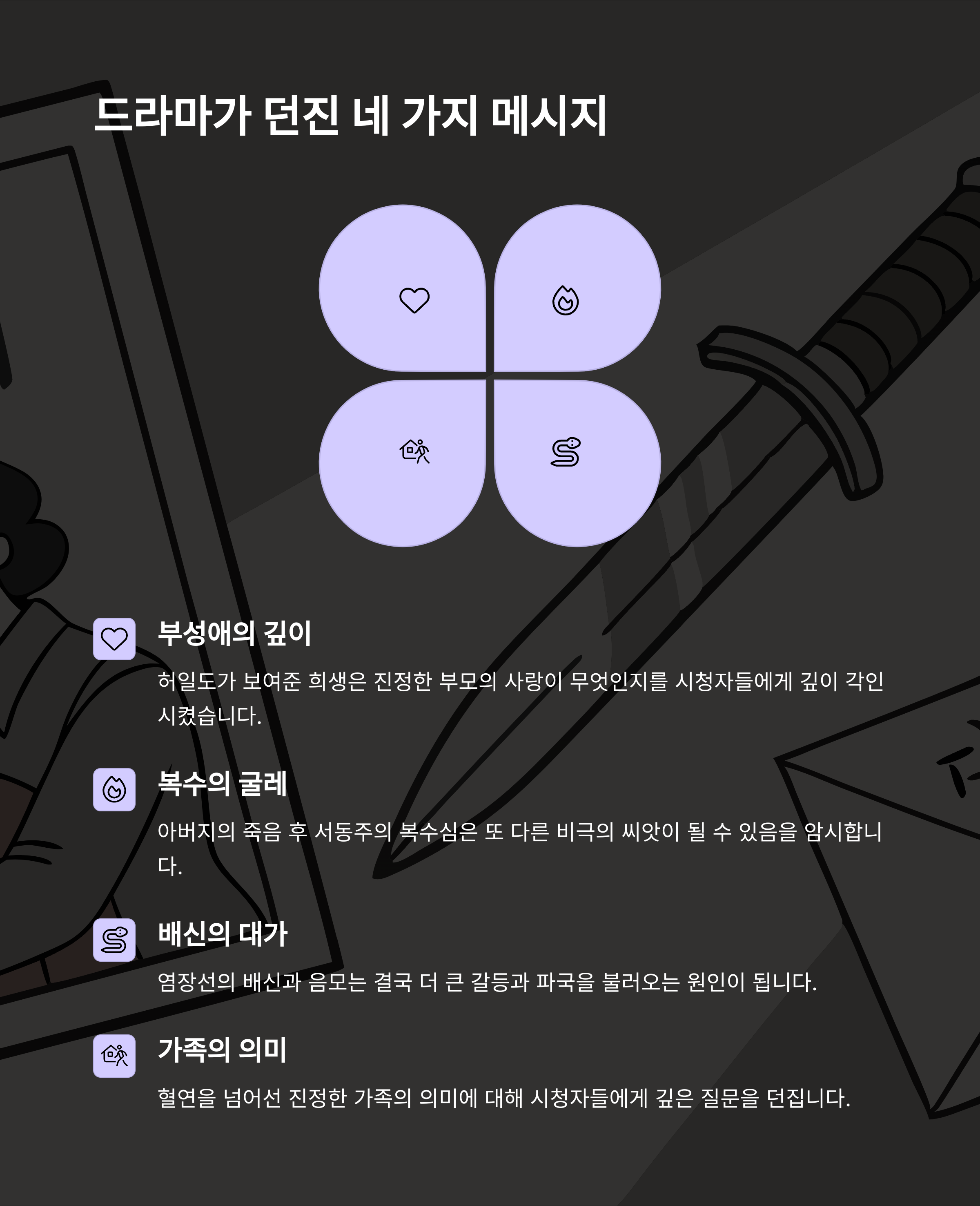 아버지의 죽음을 눈앞에서 목격하고, 그 희생이 헛되지 않게 만들기 위해서예요. 복수는 그의 슬픔과 분노가 향하는 유일한 출구였던 거죠.