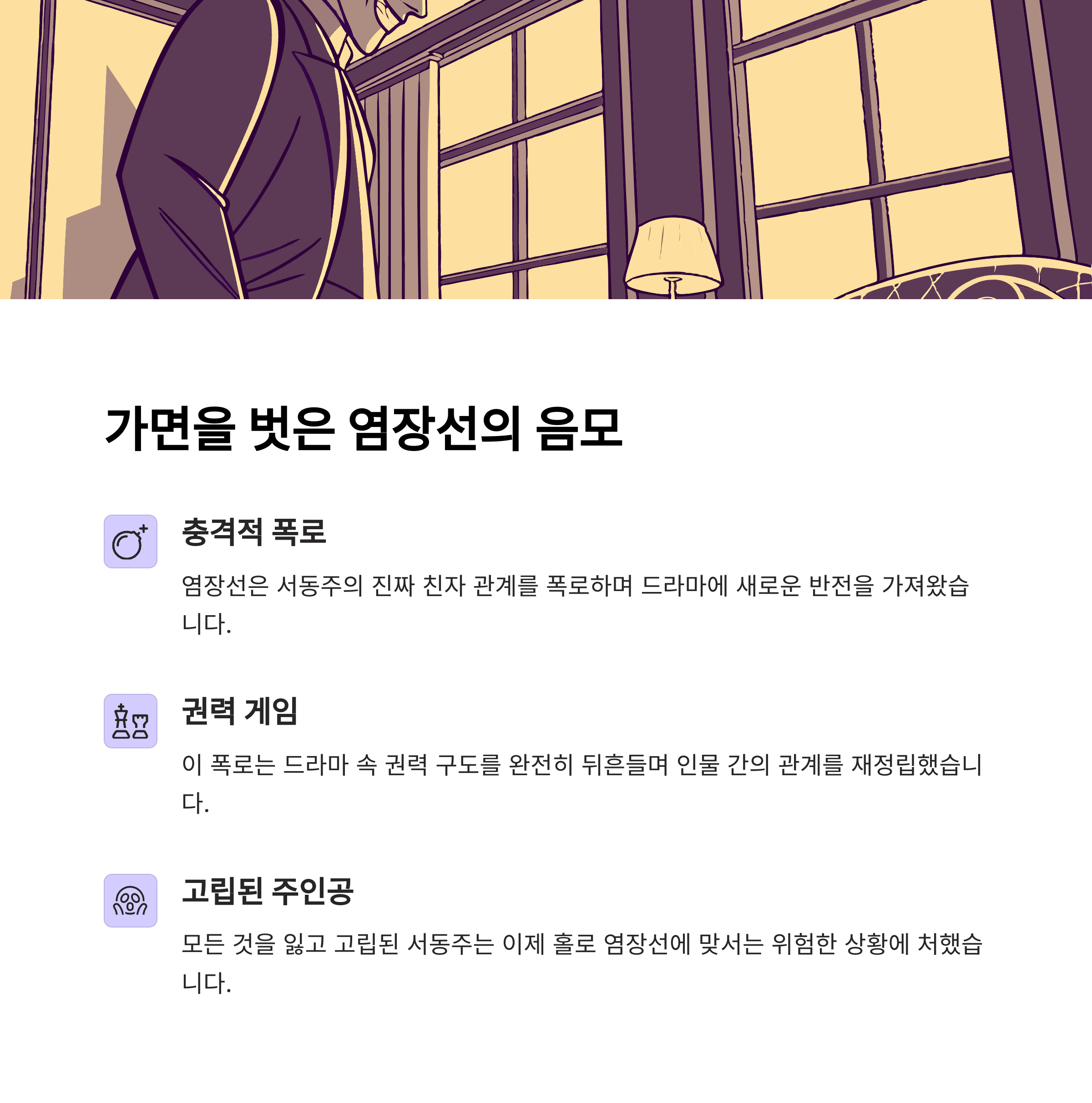 염장선의 계략은 치밀했고, 결국 서동주의 집에 조양춘이 침입하면서 위기의 순간이 찾아왔습니다. 이 장면에서 허일도는 망설임 없이 아들을 대신해 칼을 맞고, 조양춘과 함께 추락하며 생을 마감했죠. 그 장면은 잔인했지만, 동시에 아름다웠습니다. 아버지로서 처음이자 마지막으로 해줄 수 있었던 ‘희생’. 그것이 허일도의 진짜 유언처럼 느껴졌어요.