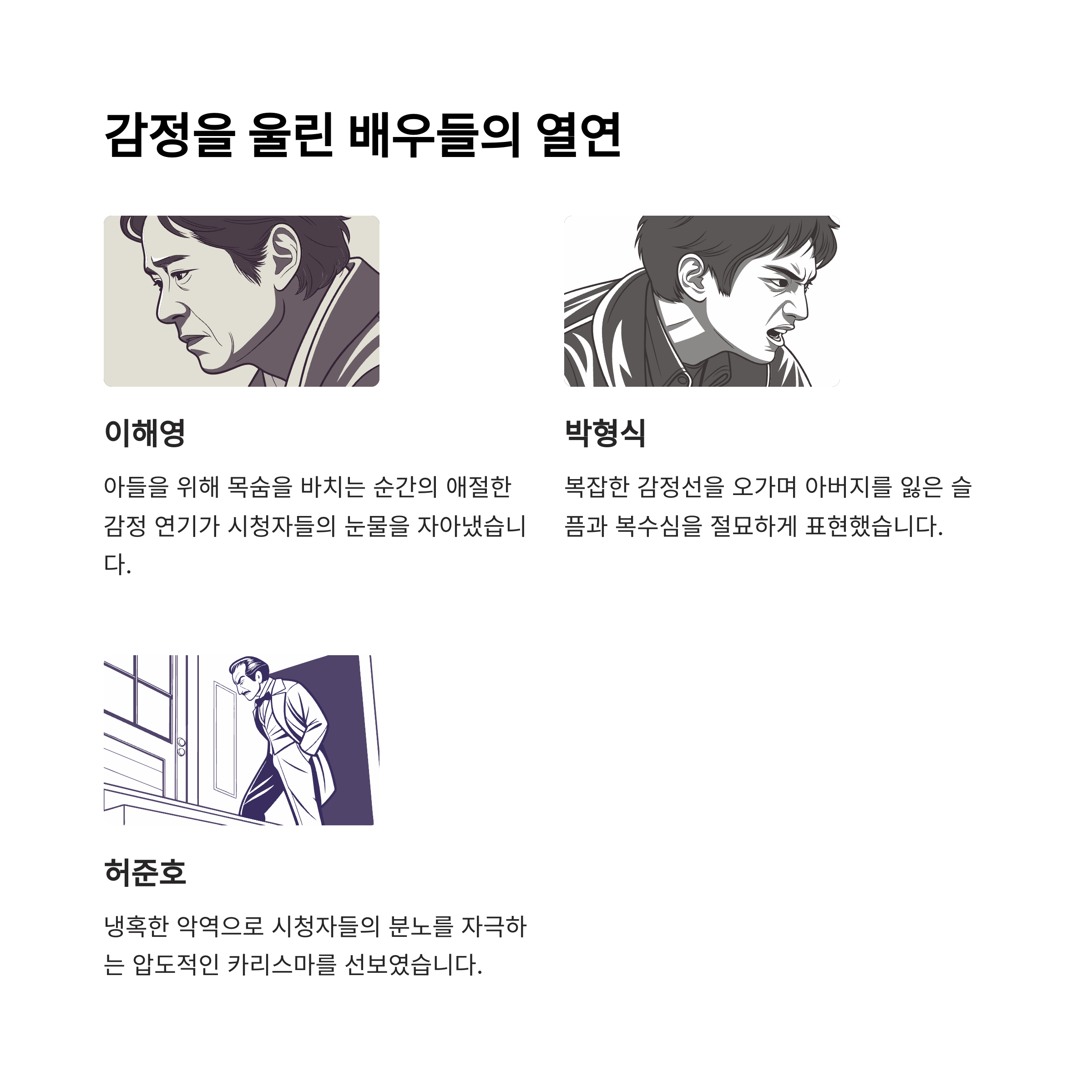 희생, 갈등, 화해, 분노… 복잡한 감정들이 하나로 터졌기 때문이에요. 특히 허일도의 죽음은 시청자 감정을 정면으로 건드렸죠.