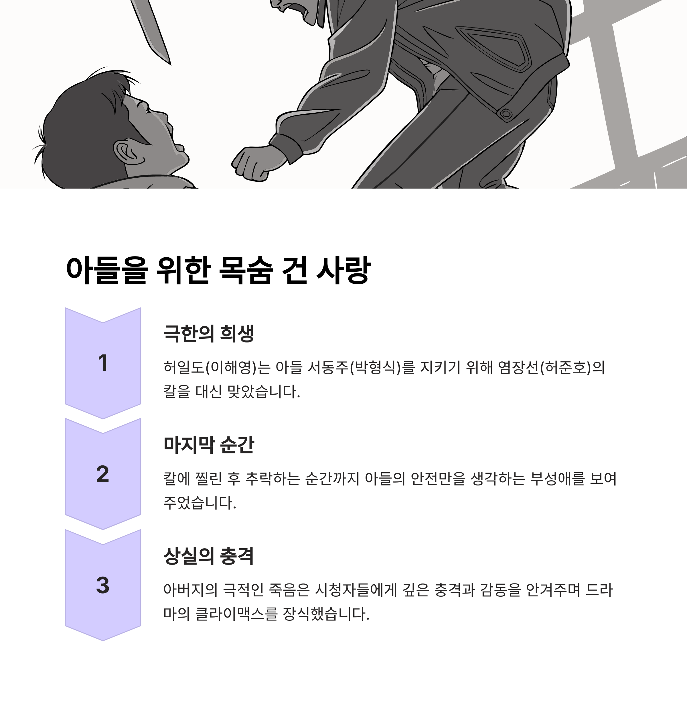 | 허일도 | 칼을 맞고 2층에서 추락 | 부정했던 아들을 위해 목숨을 내어줌 |