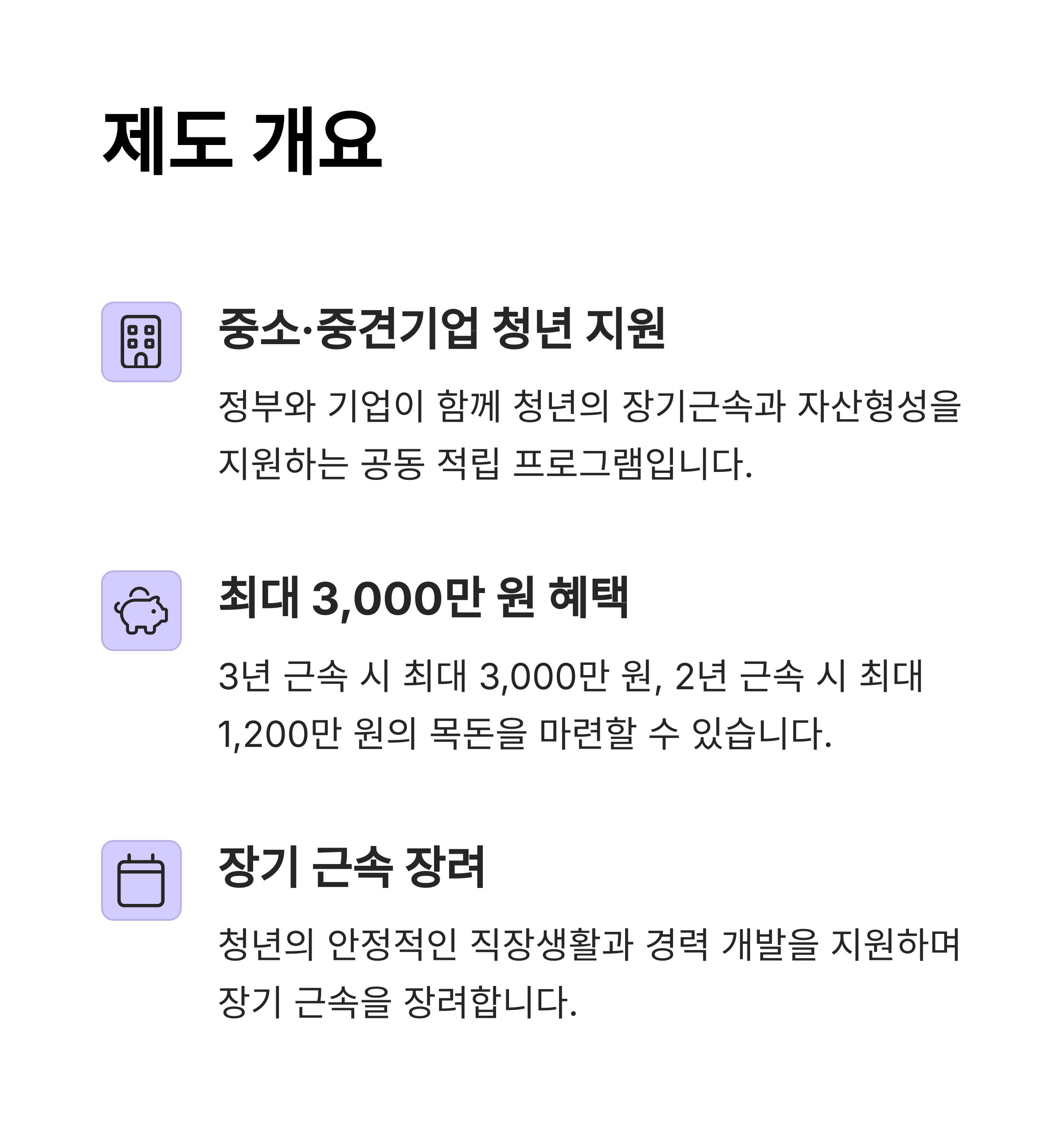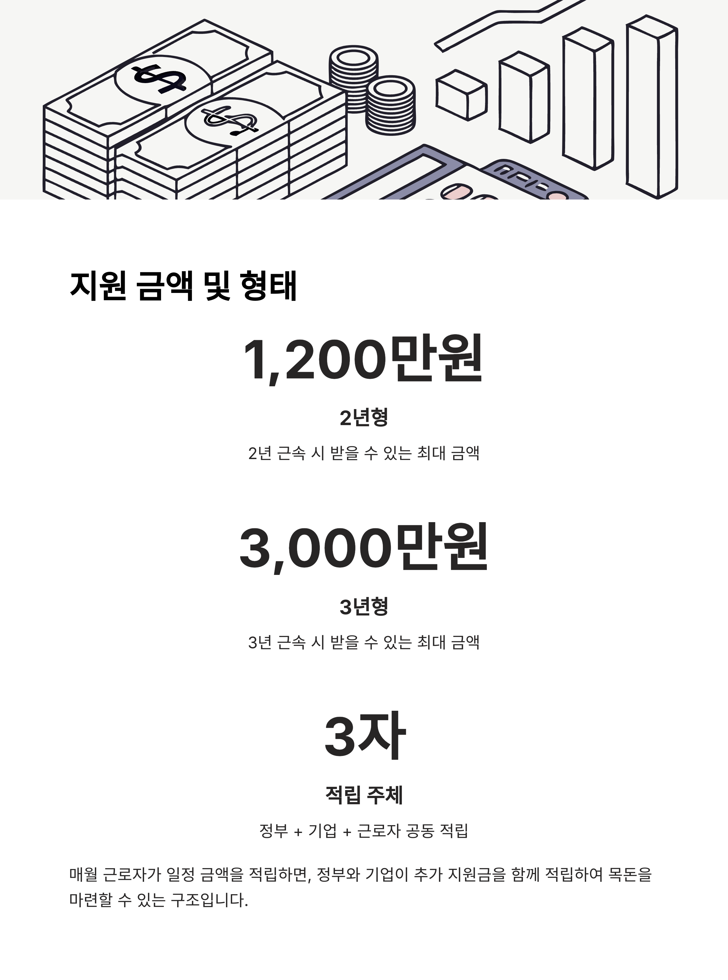쉽게 말하면, 청년은 매달 16만~20만 원 정도 적립하고, 나머지는 기업과 정부가 도와줘서 2~3년 후 최대 3,000만 원을 수령할 수 있는 거죠. 게다가 이자 소득세까지 면제되니 혜택이 꽤 쏠쏠해요.