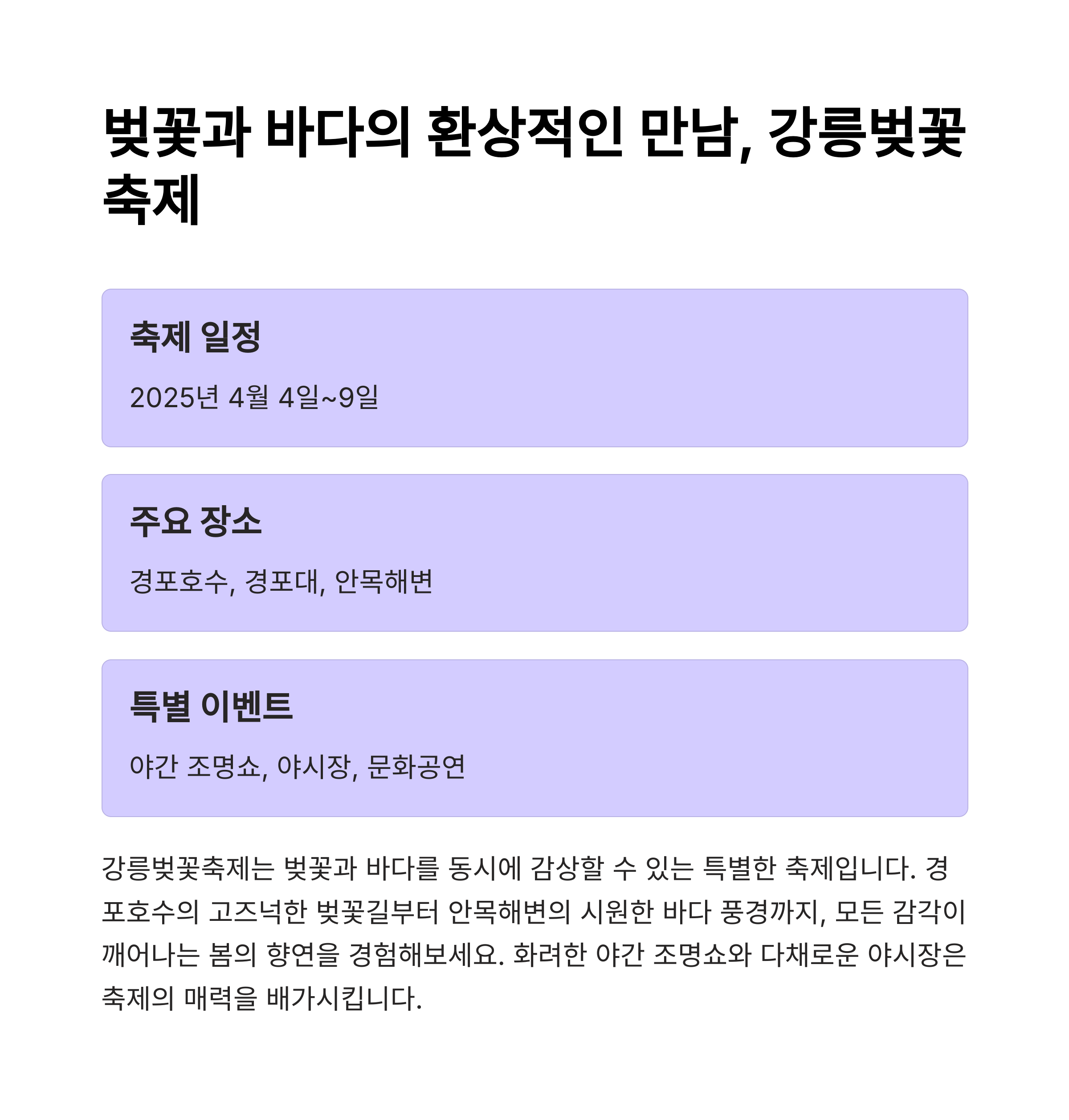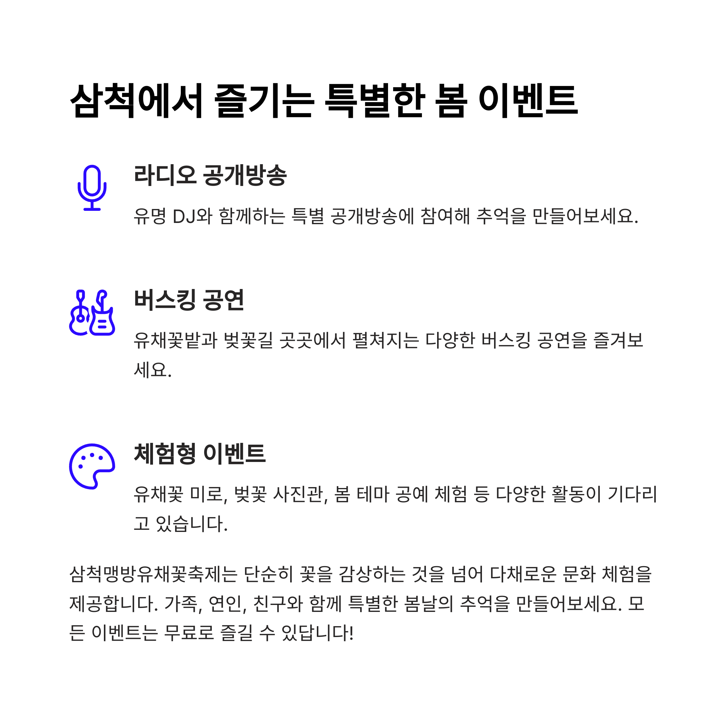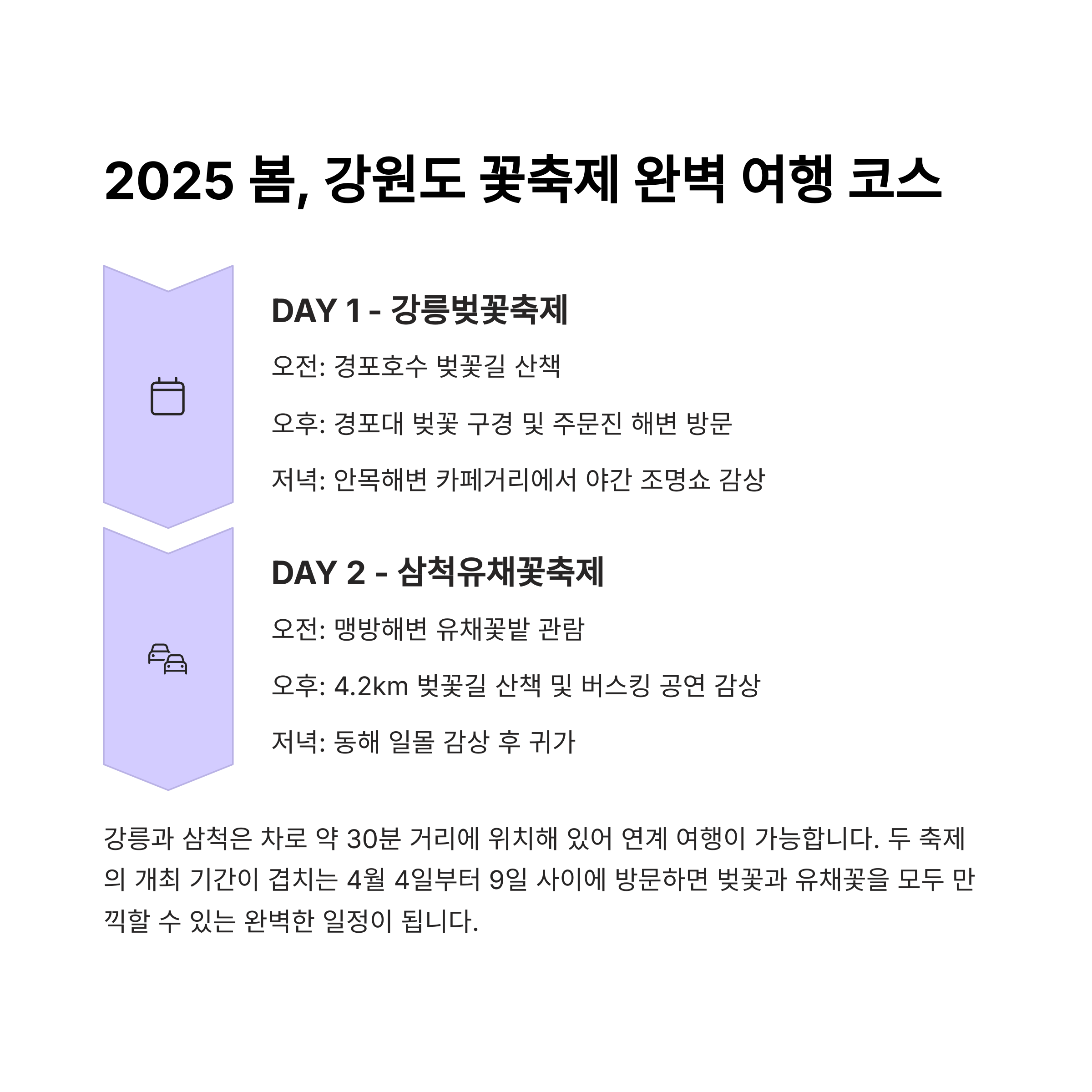 벚꽃은 전국 어디서나 볼 수 있지만, 바다와 함께, 유채와 함께라는 조건이 붙는 순간 선택지는 달라지죠. 강릉은 감성적인 풍경과 도시적 편의성을 갖춘 축제이고, 삼척은 꽃의 다양성과 체험형 콘텐츠로 가득한 자연형 축제입니다. 누구와 함께 가느냐, 어떤 분위기를 원하느냐에 따라 여러분의 선택이 달라질 거예요. 올봄, 꽃길만 걷고 싶은 여러분—강릉이든 삼척이든, 마음에 드는 축제에서 행복한 시간 보내시길 바라요!