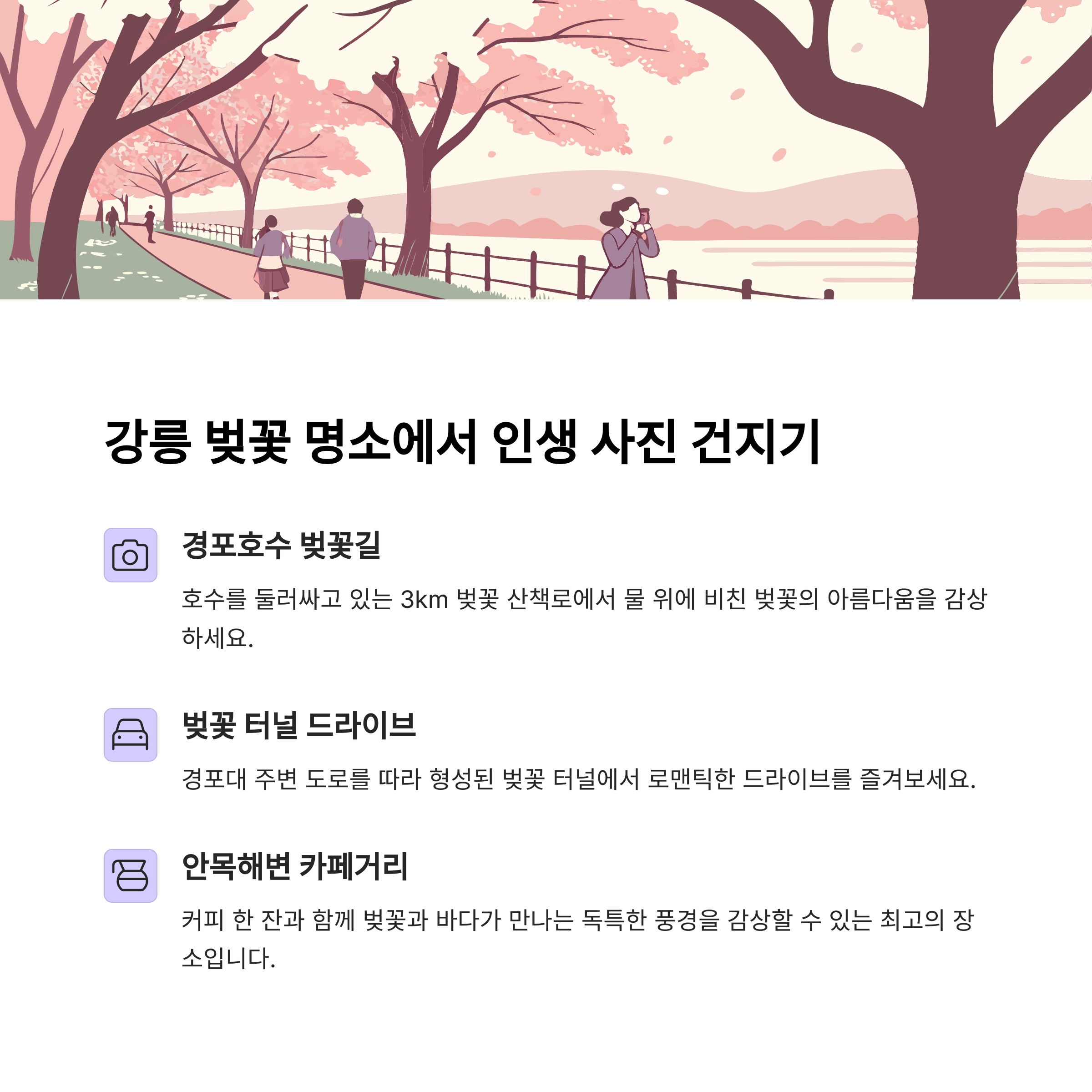 - 경포호수 둘레길: 벚꽃 터널로 유명한 산책 명소