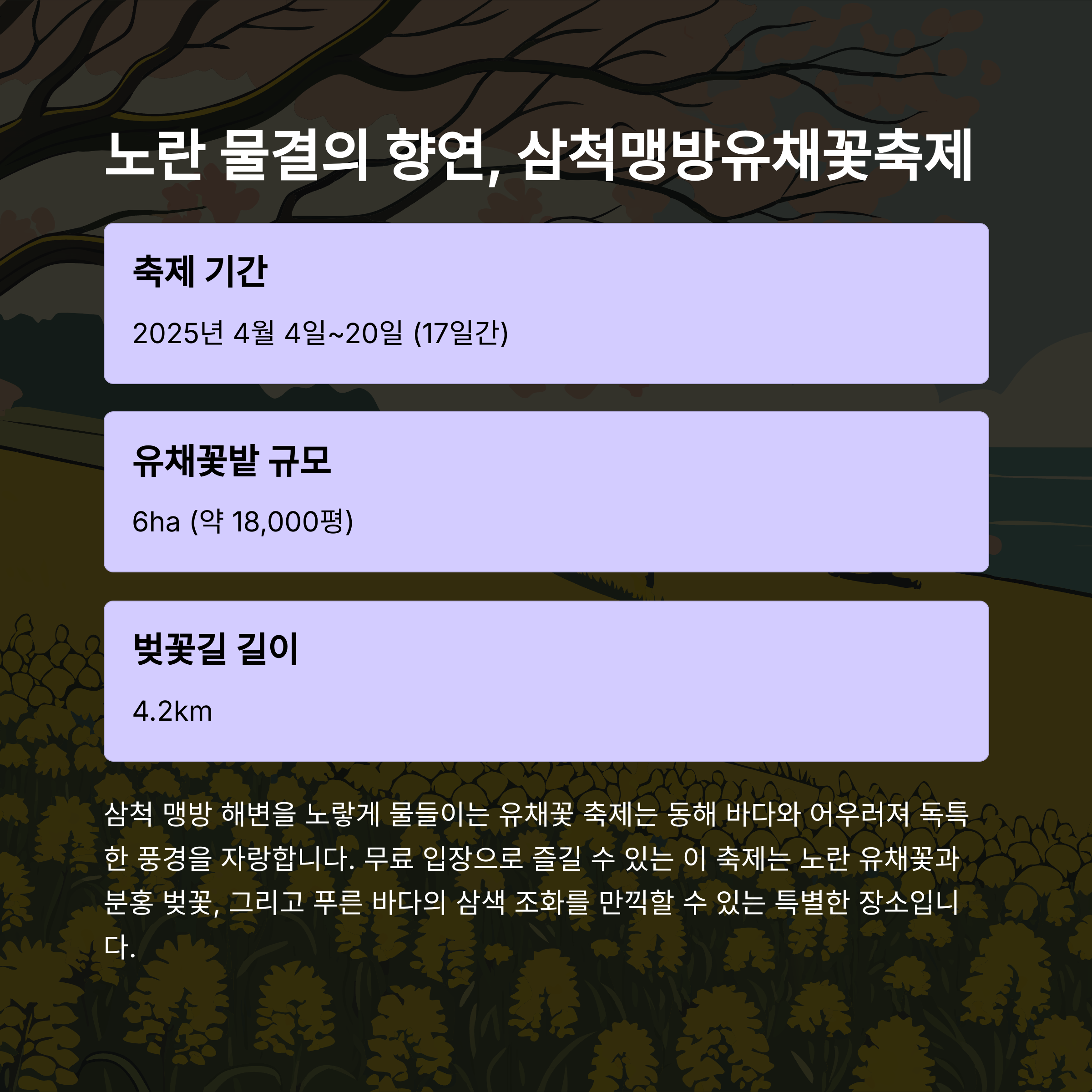 , 무려 6헥타르의 유채꽃밭과 4.2km 벚꽃길이 삼척 근덕면 상맹방리를 가득 채웁니다. 노란 유채꽃과 푸른 동해, 그리고 흐드러진 벚꽃이 만드는 삼색 조합은 말 그대로 ‘인생샷’ 스팟이죠.