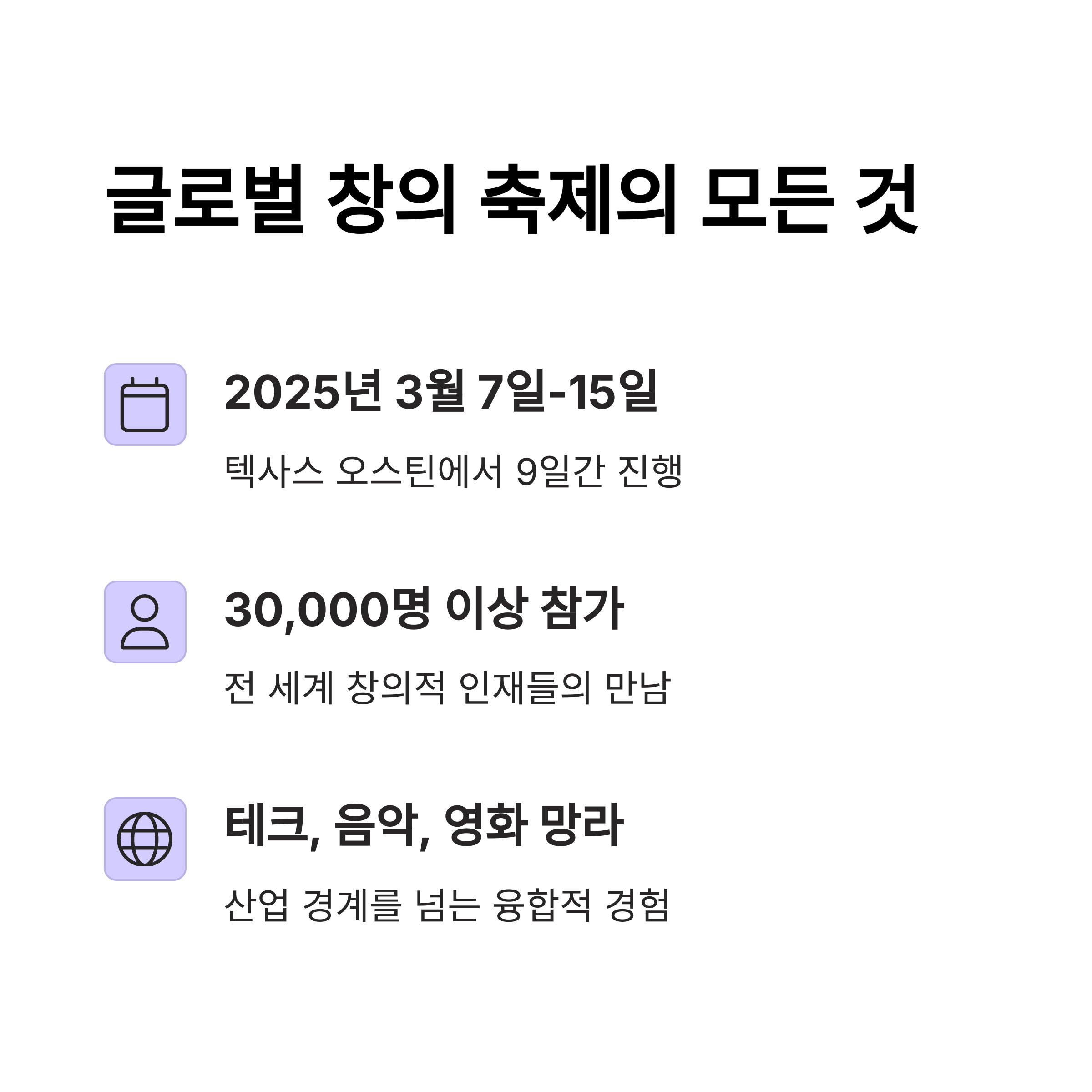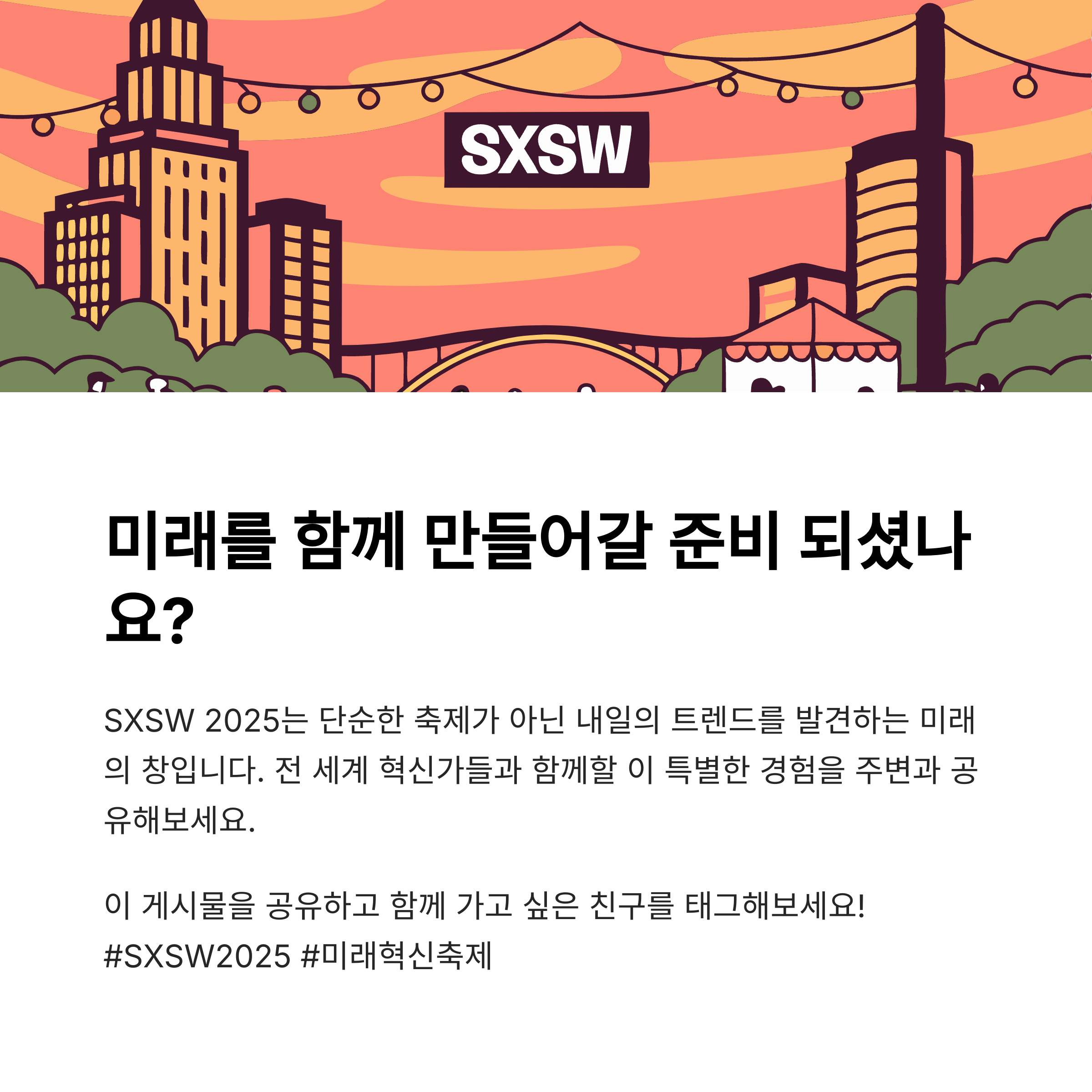 전 세계 창의인재들이 모이는 SXSW(South by Southwest), 그 현장과 여운을 그대로 담아낸 7편의 블로그 시리즈! 실제 참가자가 직접 경험하고 정리한 정보만 담았습니다. 처음 준비하는 사람도, 다녀온 사람도, 다음을 준비하는 사람도 모두를 위한 A to Z 실전 가이드입니다.