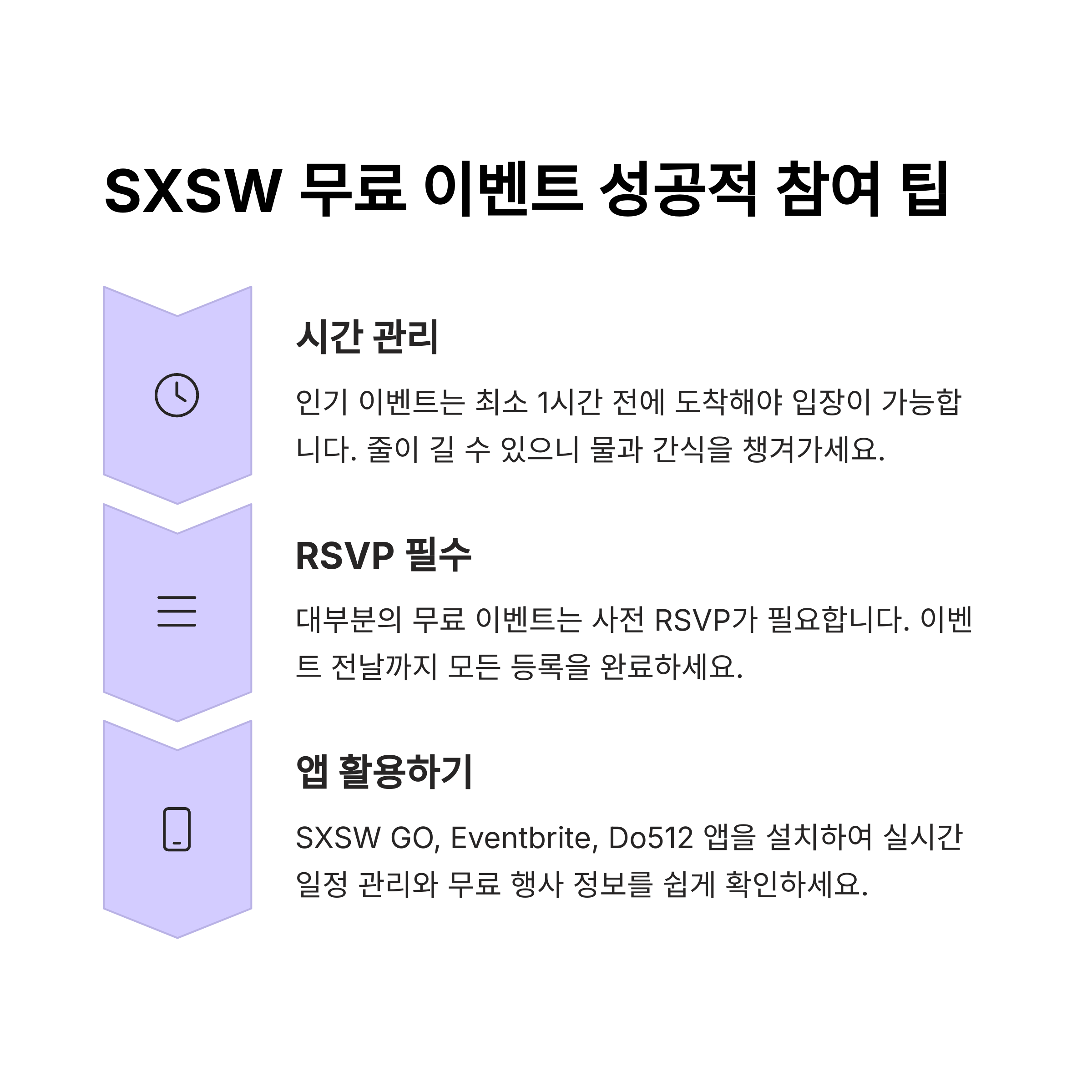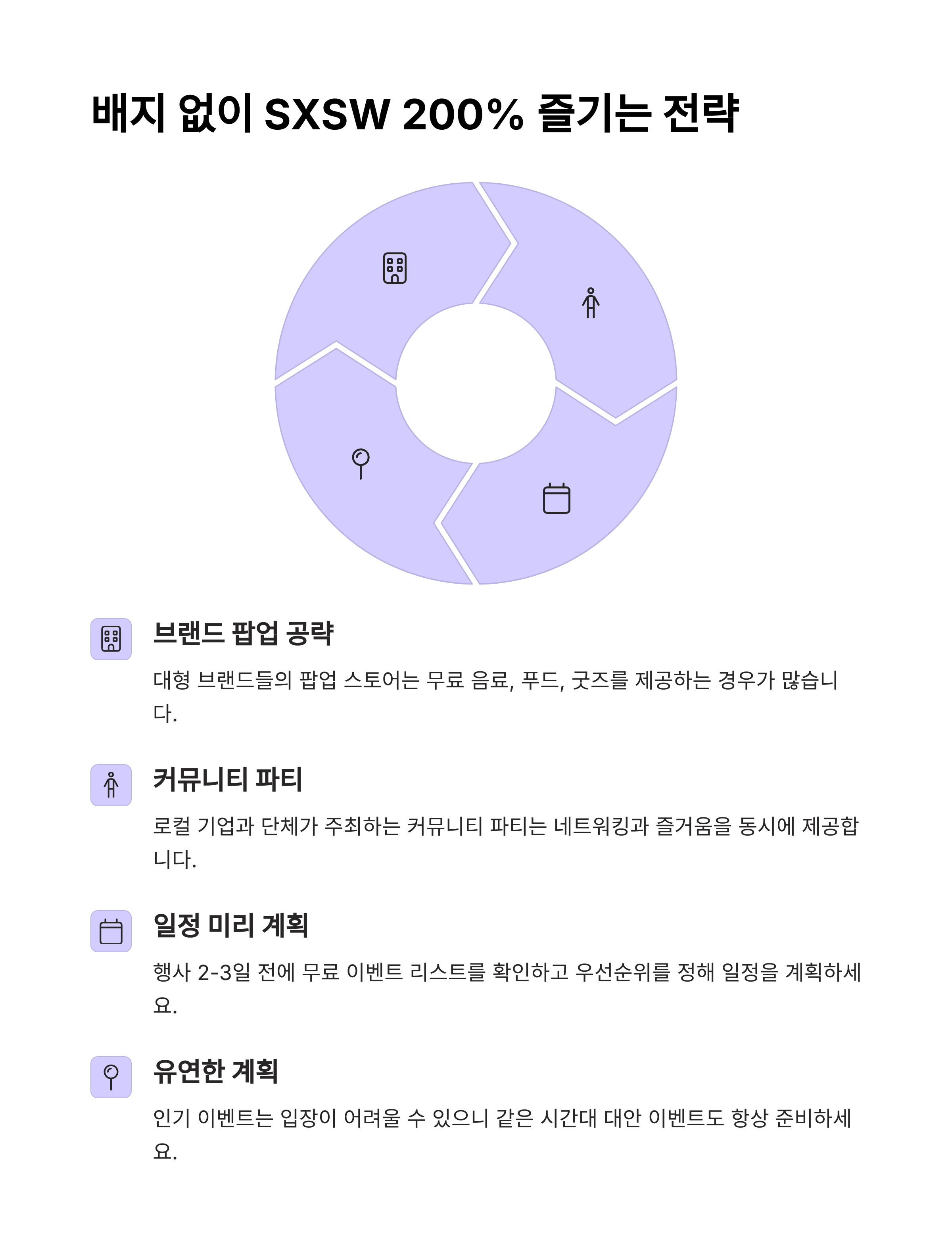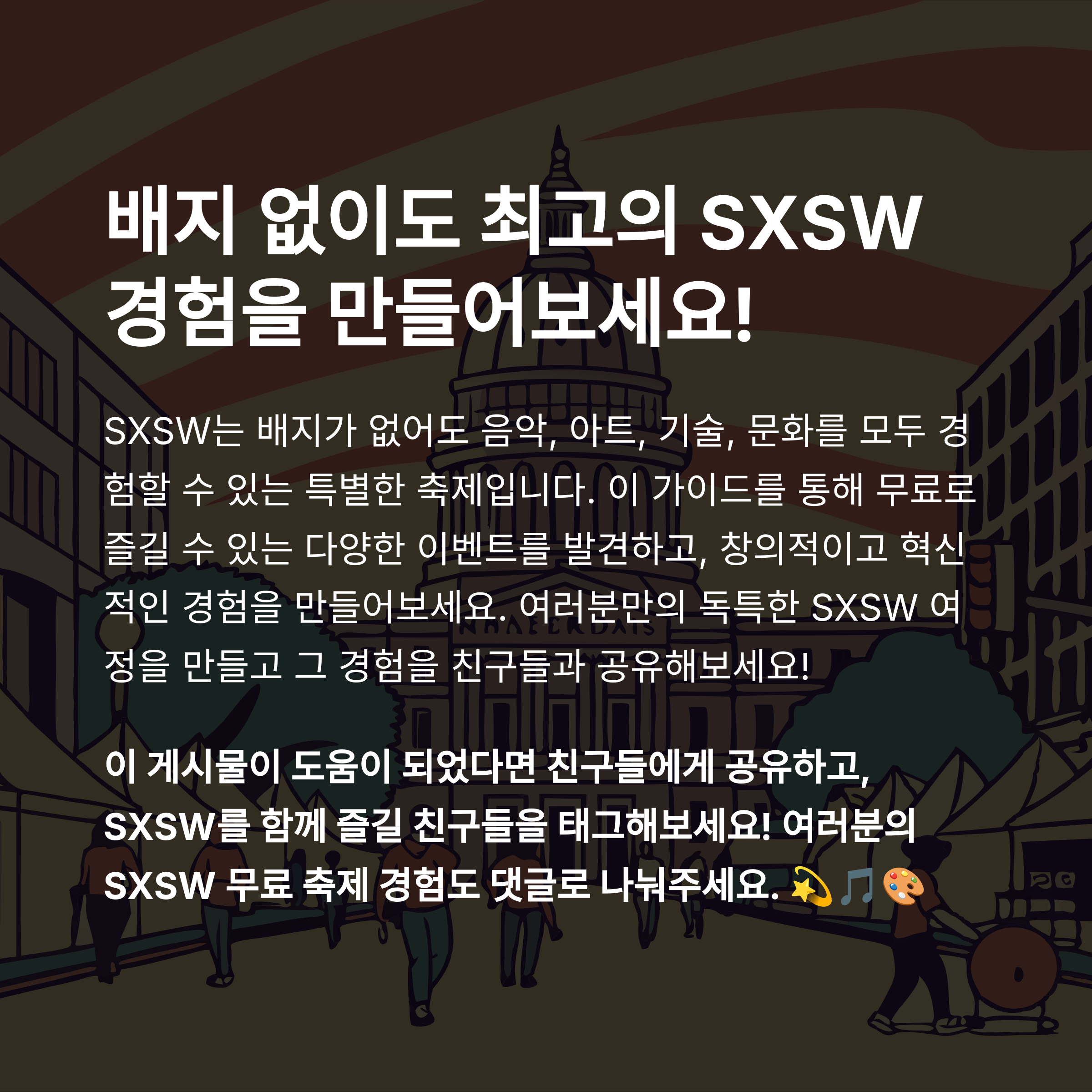 SXSW는 반드시 배지가 있어야만 즐길 수 있는 행사가 아닙니다. 전략만 잘 세우면 무료로도 충분히 풍성한 경험이 가능하니까요! 오늘 알려드린 노하우로 부담 없이 글로벌 축제를 체험해보세요. 다음 시리즈에선 SXSW 현장 분위기와 SNS 후기에서 인기 있었던 핫플레이스들을 소개할게요!
