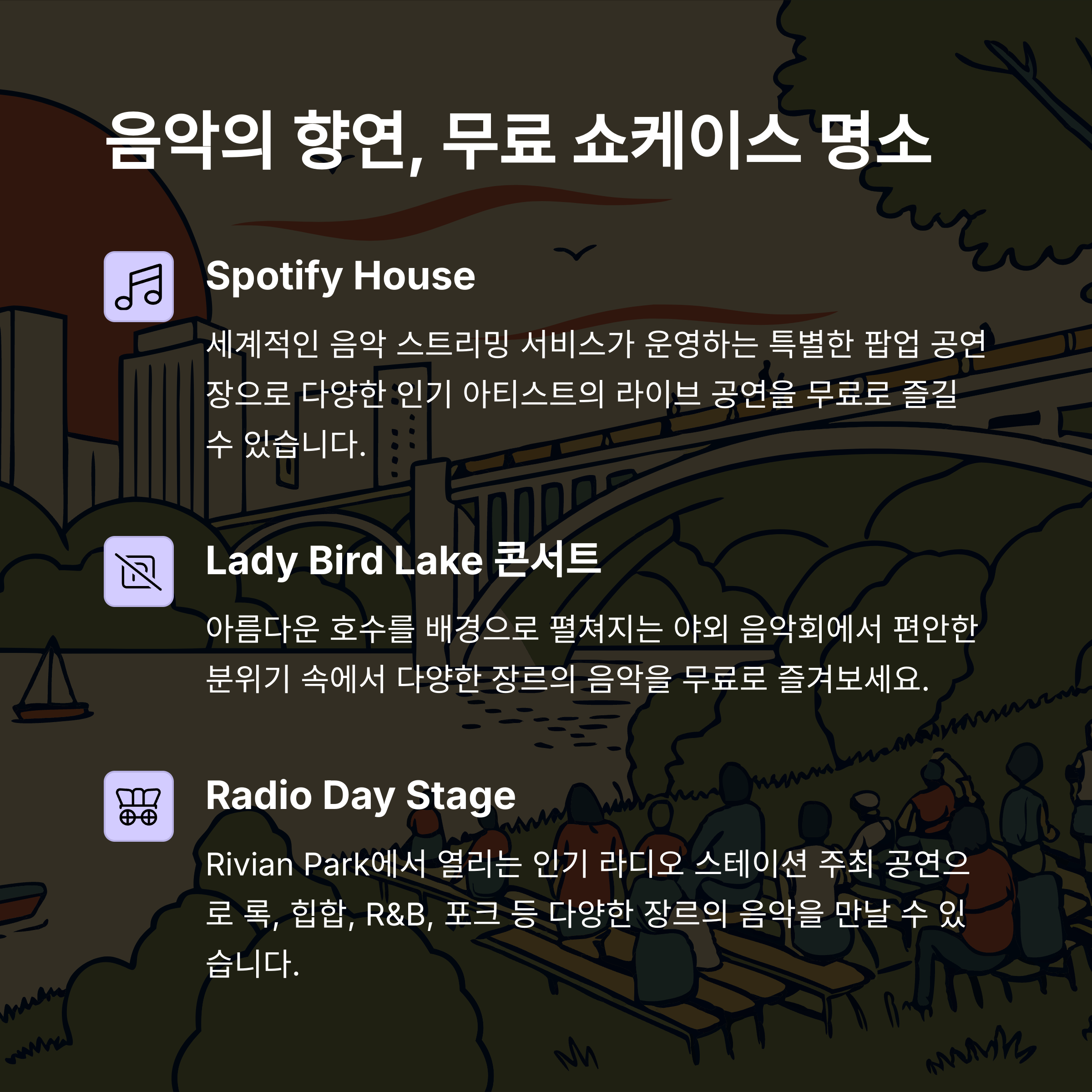 SXSW 하면 공식 배지부터 떠오르지만, 사실 배지가 없어도 즐길 수 있는 콘텐츠가 꽤 많습니다. 특히 음악 쇼케이스, 브랜드 팝업, 커뮤니티 파티 등은