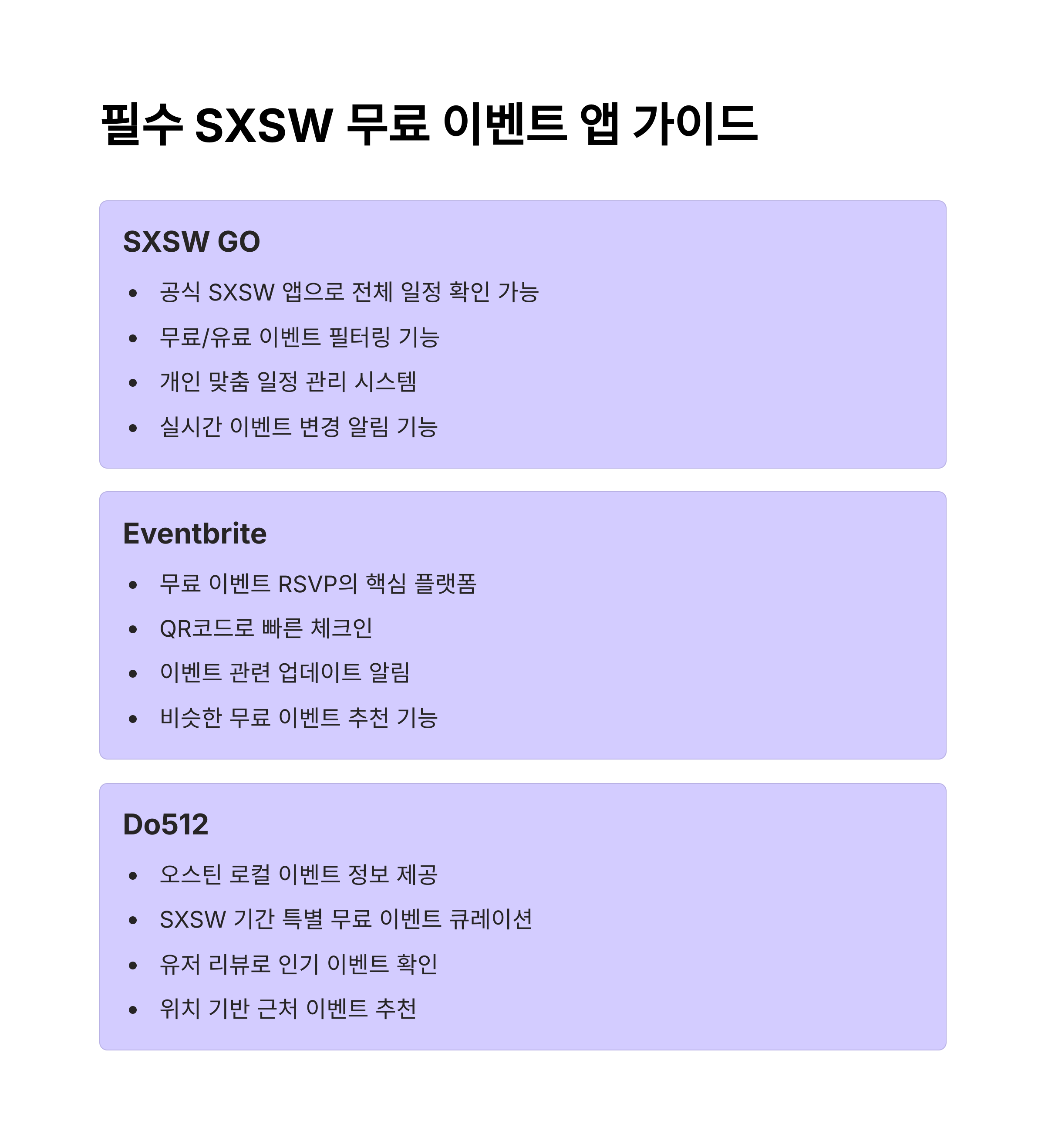 - Do512.com: 오스틴 현지 문화 일정 포털 – "SXSW FREE" 섹션 필수 체크!