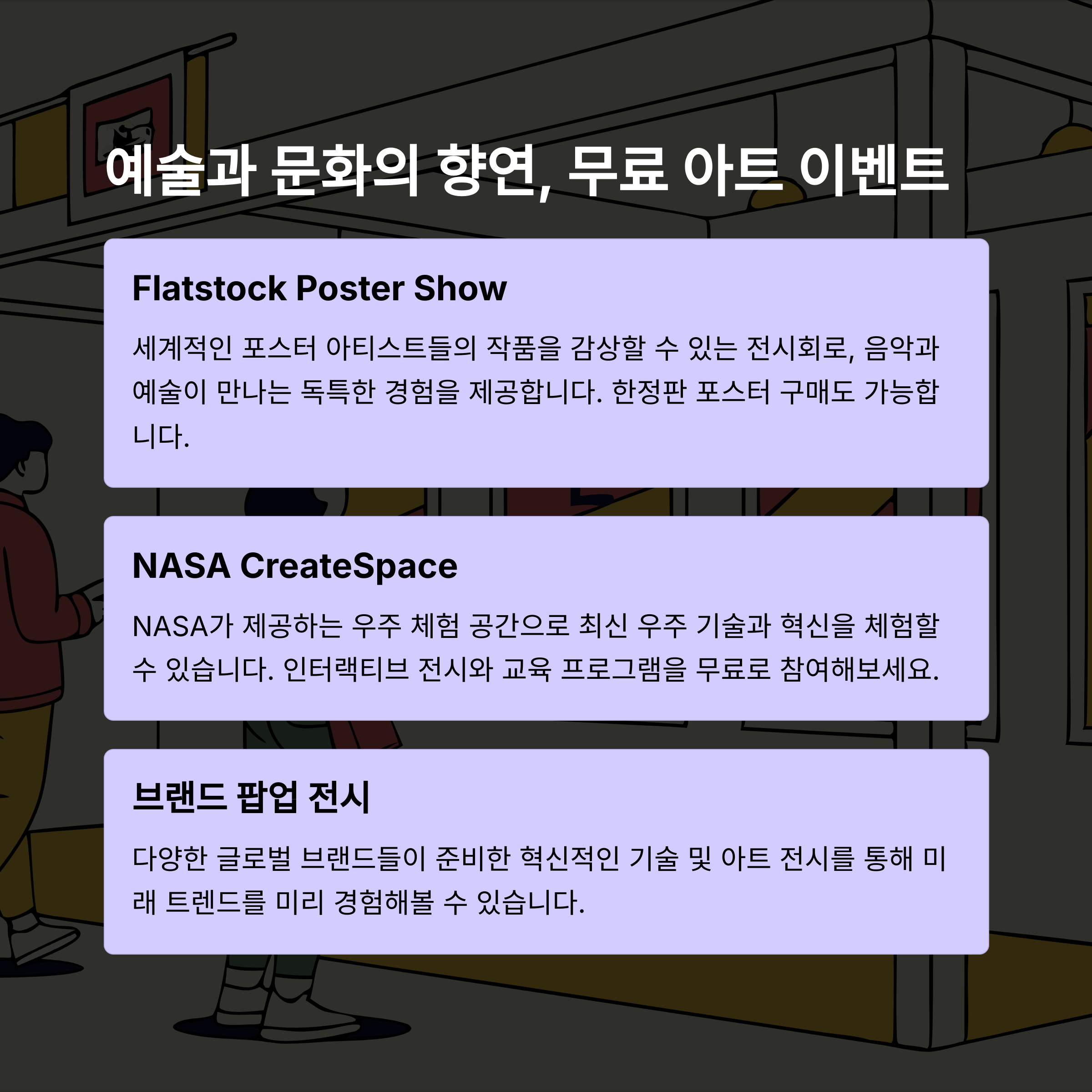 - RSVP는 필수! 무료 이벤트 대부분은 사전 등록(예약)이 필요해요. RSVP 페이지를 미리 저장해두세요.