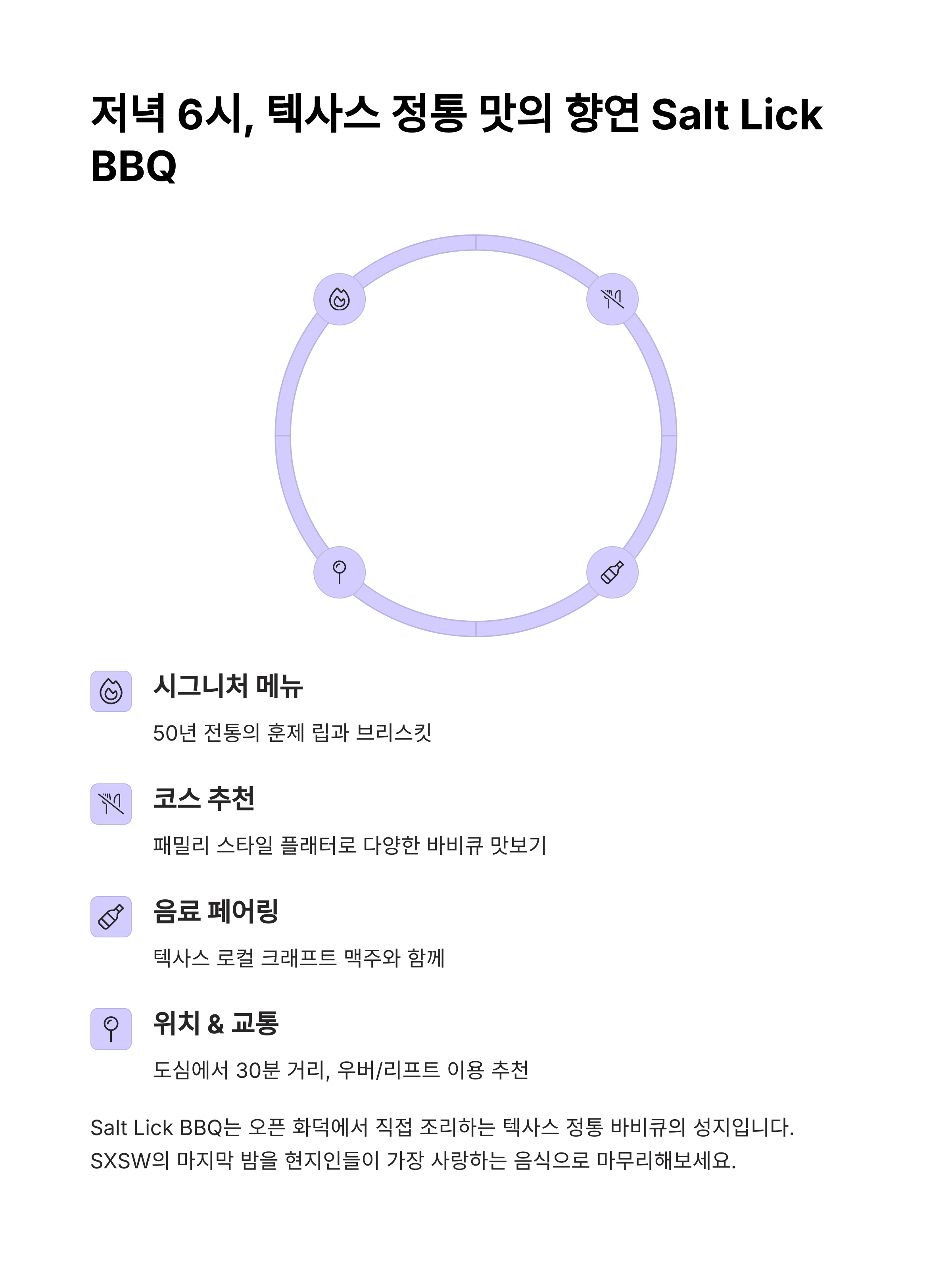 떠나기 전 현지 바비큐로 배 채우고, 텍사스의 맛을 추억 속에 저장하세요.
