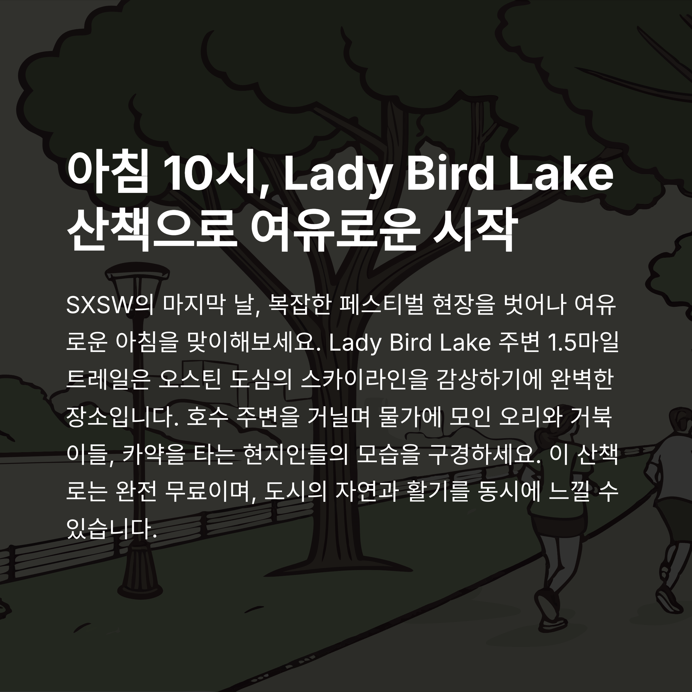 - 10:00 – Lady Bird Lake 산책