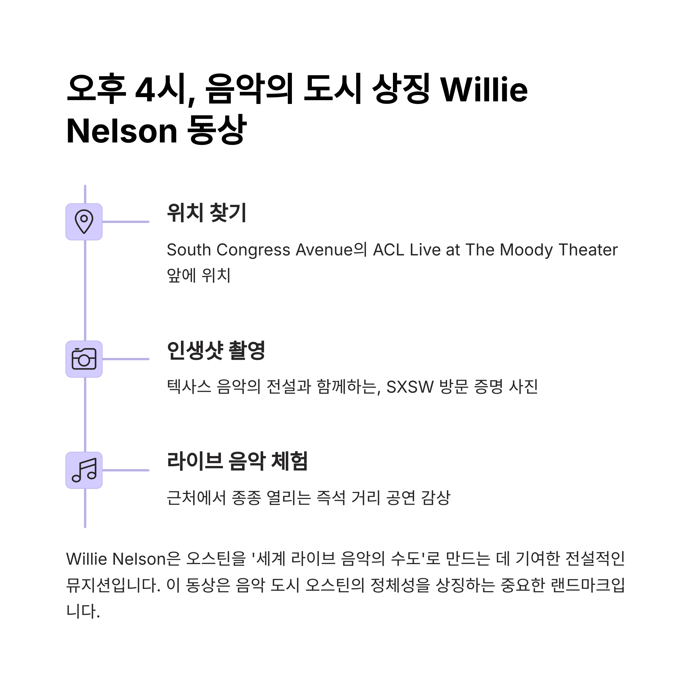 핸드메이드 굿즈 & 지역 작가들의 아트워크가 모인 마켓. 유니크한 기념품 득템 가능! - 16:00 – Willie Nelson Statue 앞에서 기념사진