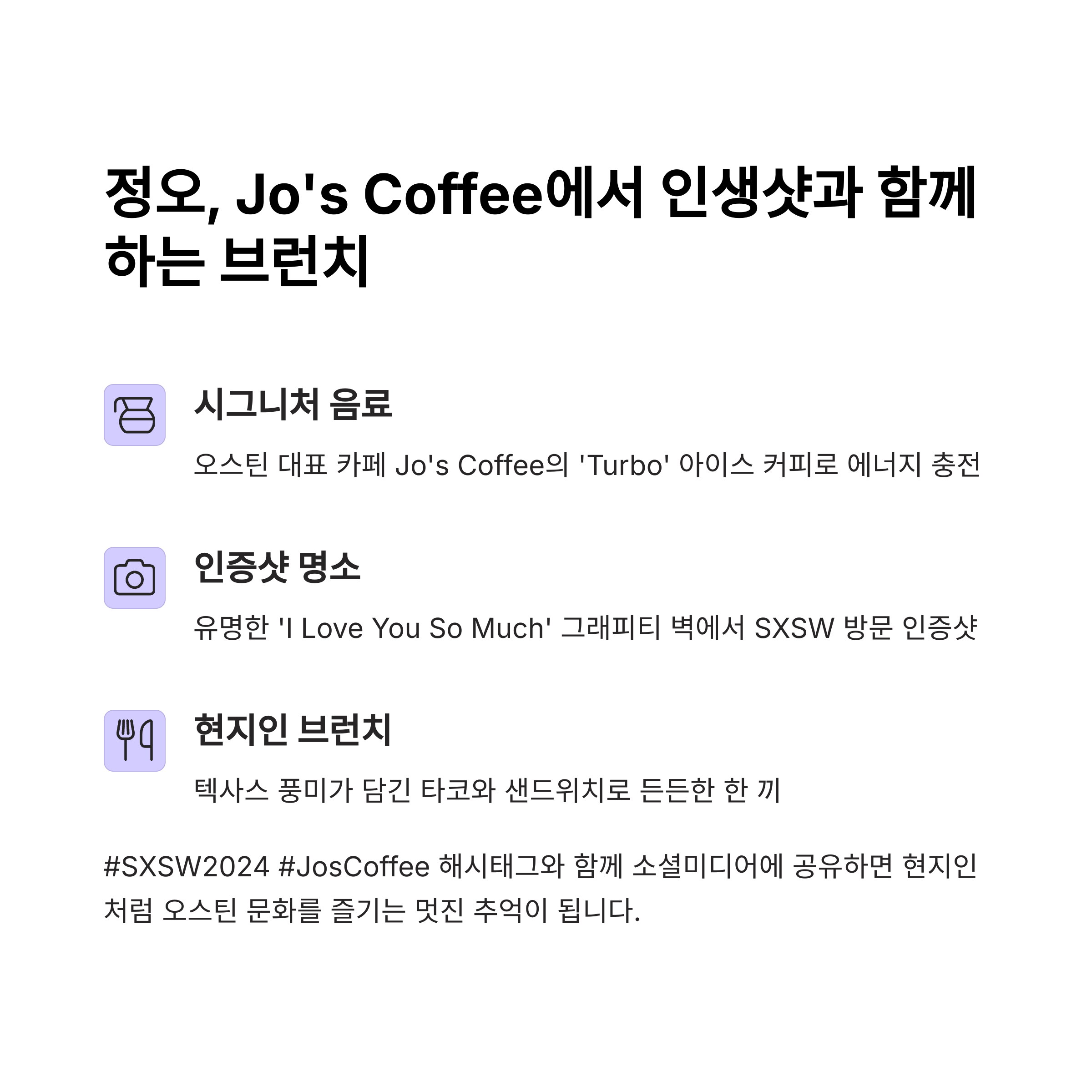 오스틴에서의 마지막 하루가 더 오래 기억에 남도록, 오늘의 루트와 기념품 리스트를 참고해보세요. 그리고 곧 이어질 SXSW 시리즈 마지막 편도 기대해주세요! 🌟