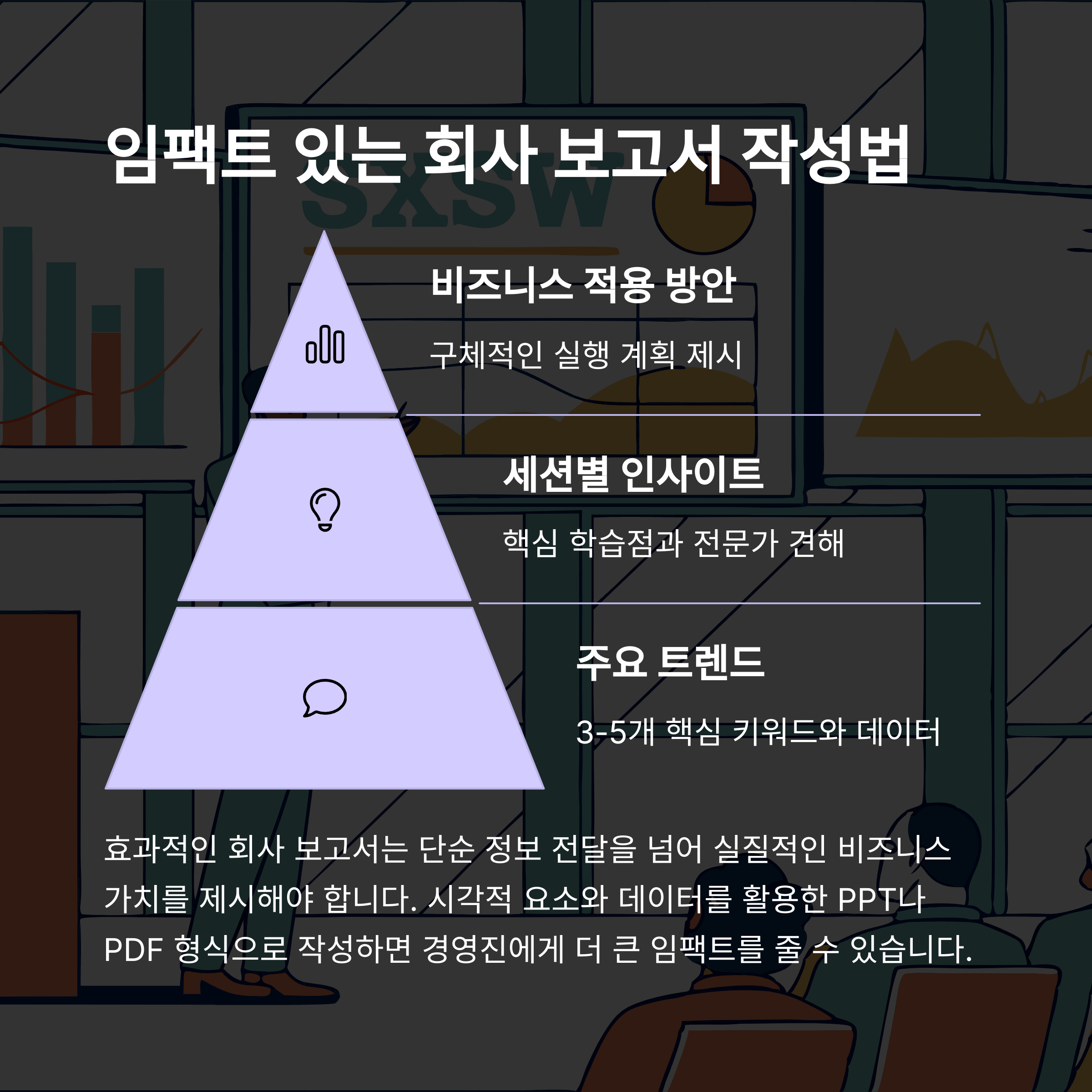 보고서 작성은 상사에게 SXSW 참가의 가치를 입증하는 기회입니다. 느낀 점보다 실제 인사이트 중심으로 정리해보세요.