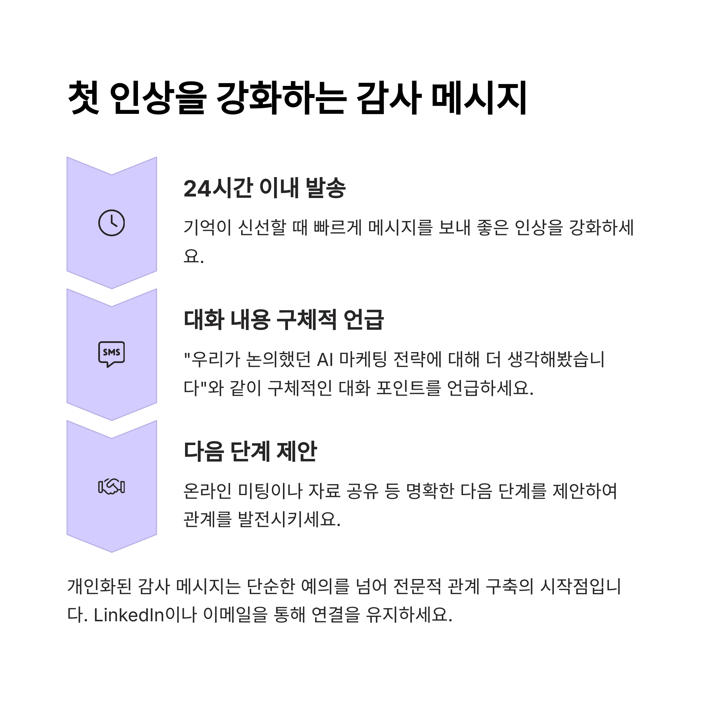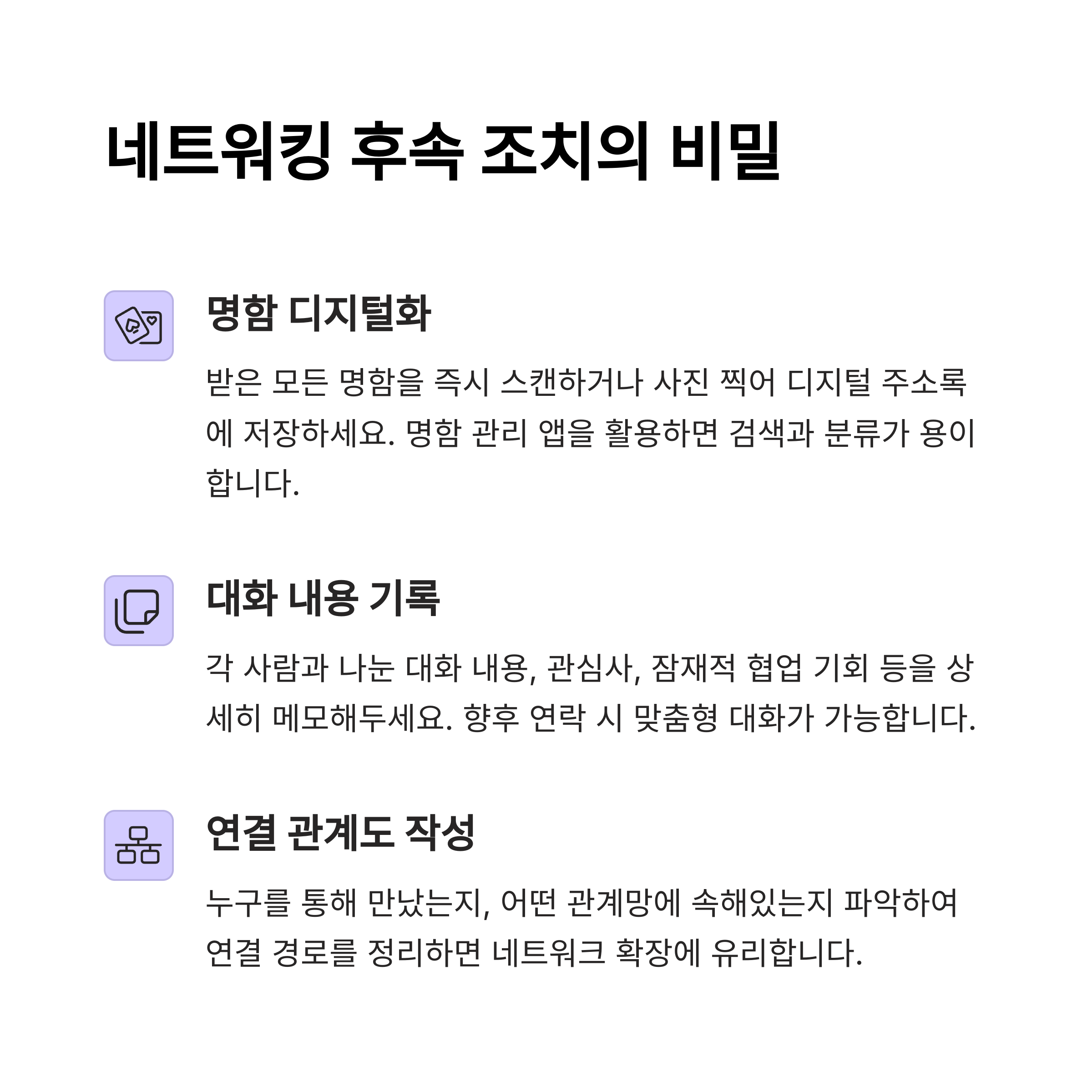 핵심 키워드와 받은 명함 정리부터 시작하세요. 감정은 잊기 쉽지만, 정보는 남겨야 합니다.
