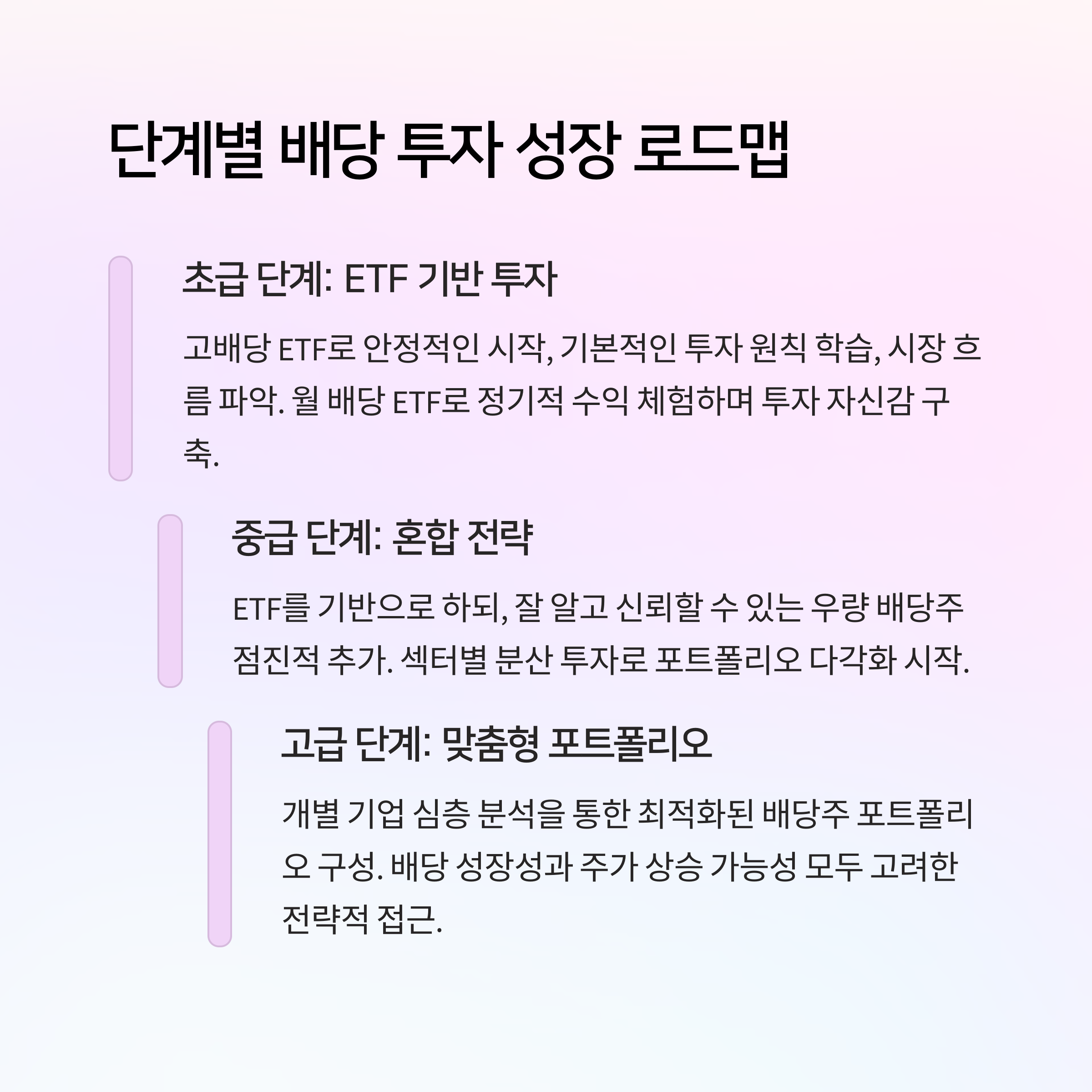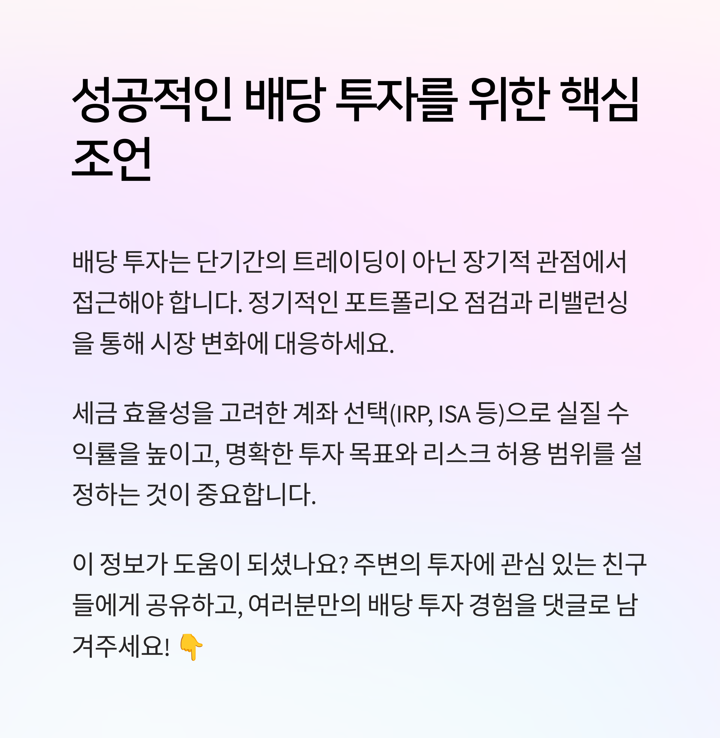 ETF냐, 개별주냐. 정답은 없어요. 다만 내 성향, 시간, 목표 수익률에 따라 선택은 달라질 수 있죠. 저는 처음엔 ETF로 시작해서, 어느 정도 익숙해진 뒤 개별주도 병행했어요. 이렇게 '안정과 수익의 균형'을 맞추는 게 저한텐 잘 맞았거든요. 여러분도 오늘 글을 통해 나에게 맞는 배당 전략이 무엇인지 조금 더 명확해졌길 바라요. 다음 편에서는 ‘배당 성장주 전략’에 대해 깊이 있게 다뤄볼게요. 기대해주세요!