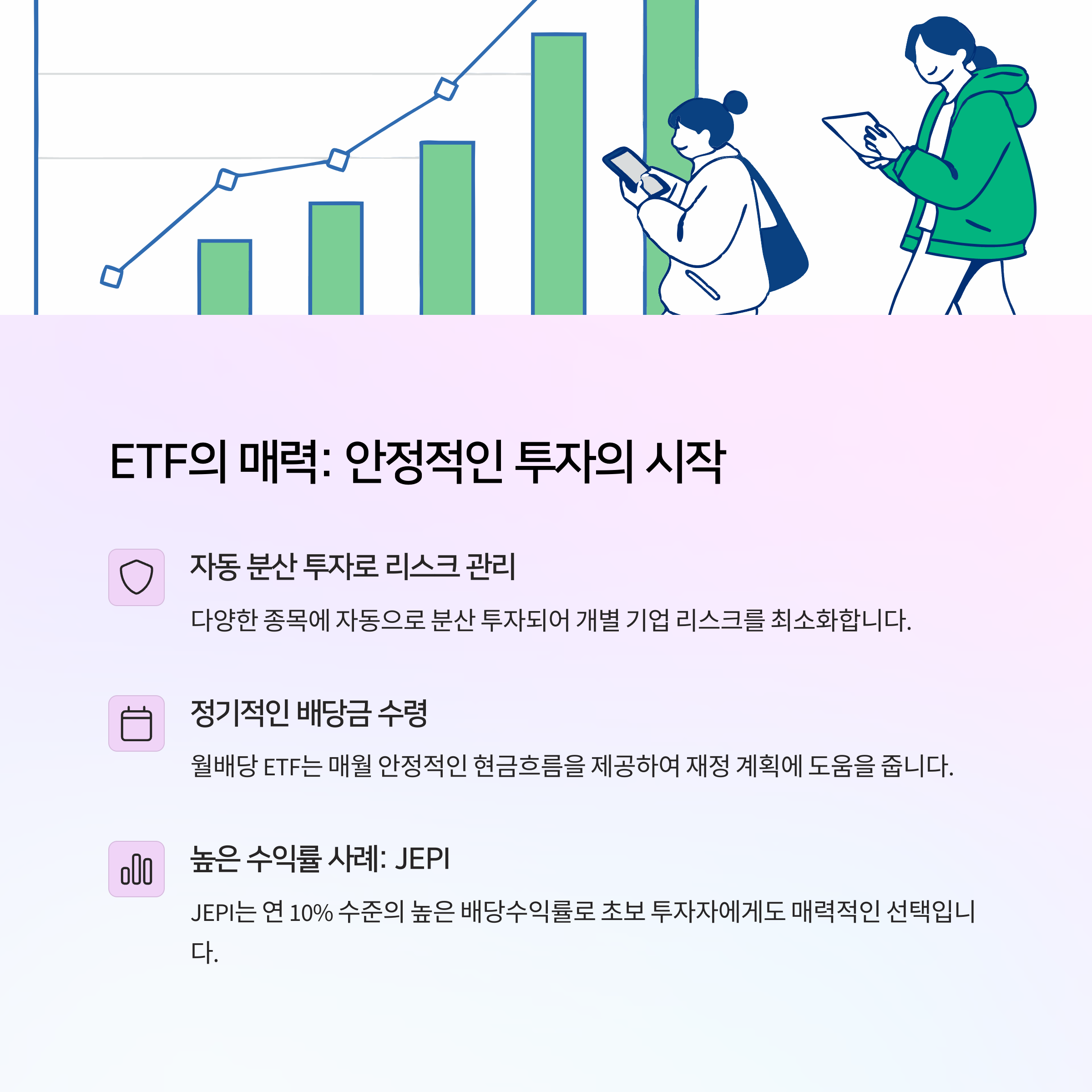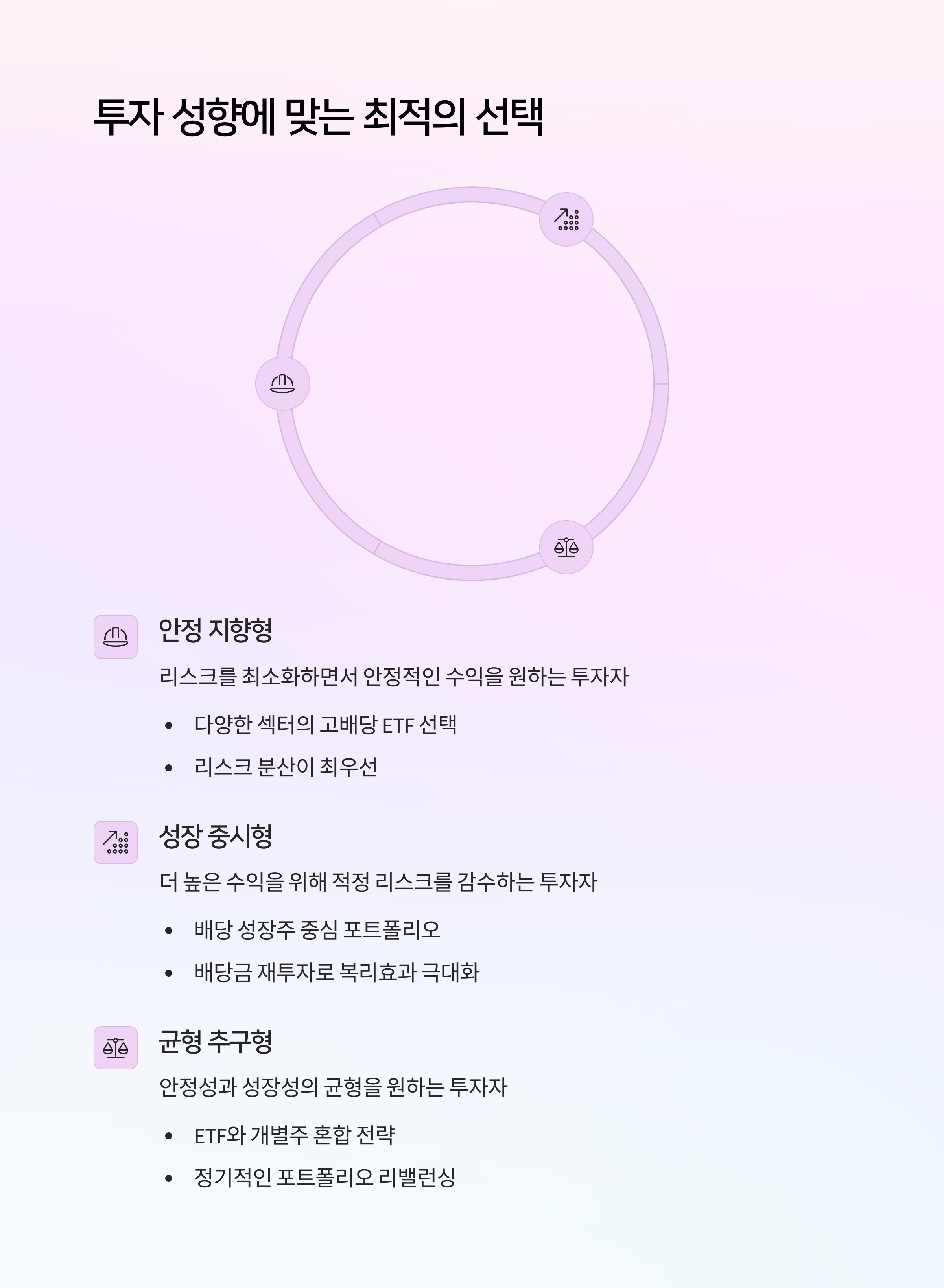 투자 경험이 많지 않다면 ETF부터 시작하는 걸 추천드려요. 자동 분산, 관리 편의성 면에서 부담이 적고 안정적인 배당을 기대할 수 있어요.