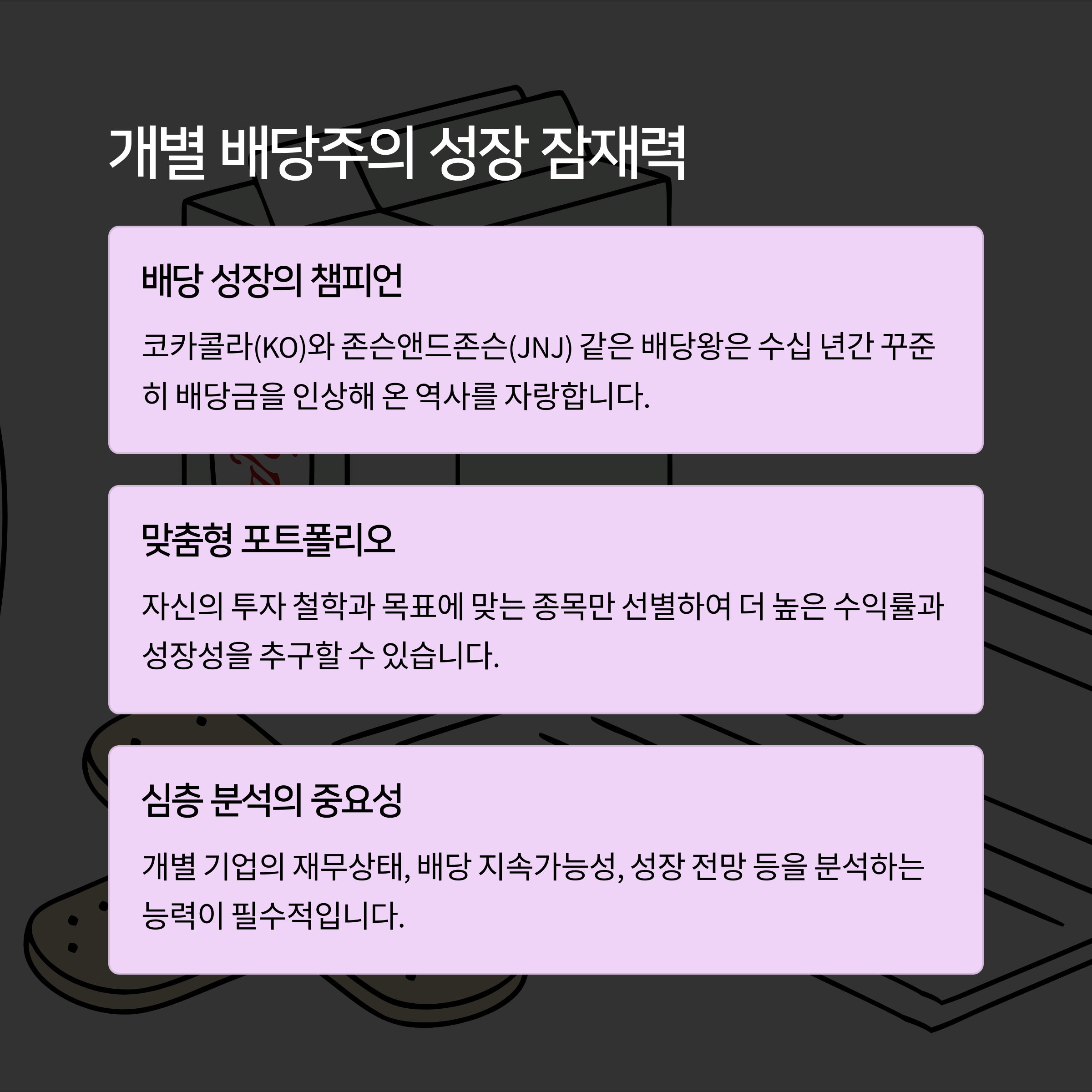 이런 ETF의 장점은 자동으로 분산 투자가 된다는 점! 배당 받으면서 리스크도 줄이고 싶은 분들에게 딱이에요. 반면, 직접 고른 개별주식은 그만큼 리스크도, 보상도 더 크겠죠?