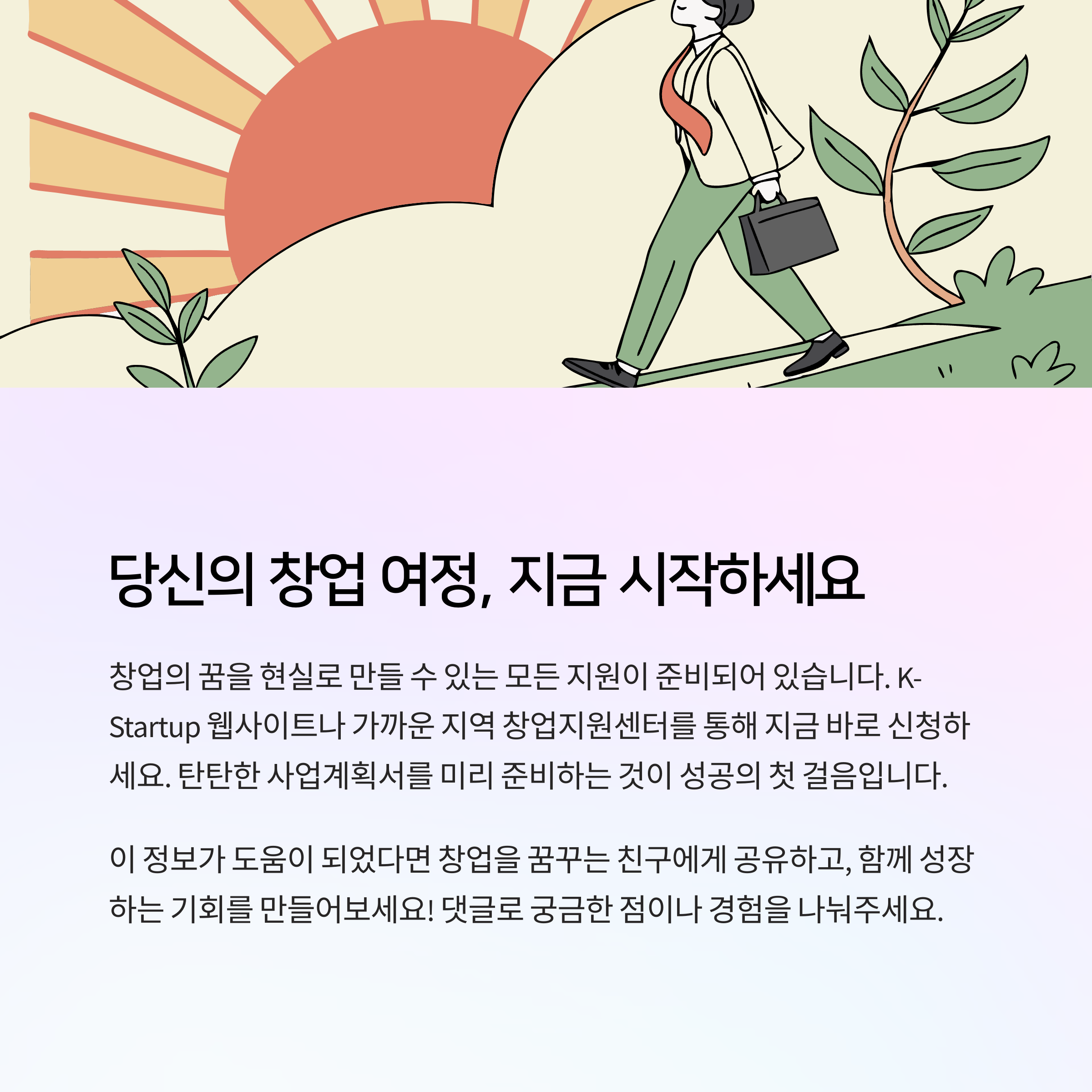 지원금은 많지만, 내게 맞는 프로그램을 찾고, 미리 준비하는 사람만이 그 기회를 잡을 수 있습니다. 지금 당장 K-Startup 또는 지역 창업지원센터 홈페이지에서 나에게 맞는 프로그램을 하나 골라보세요. 다음 편에서는 신청 시 꼭 필요한 ‘사업계획서’ 작성법을 실전 예시와 함께 소개할게요!