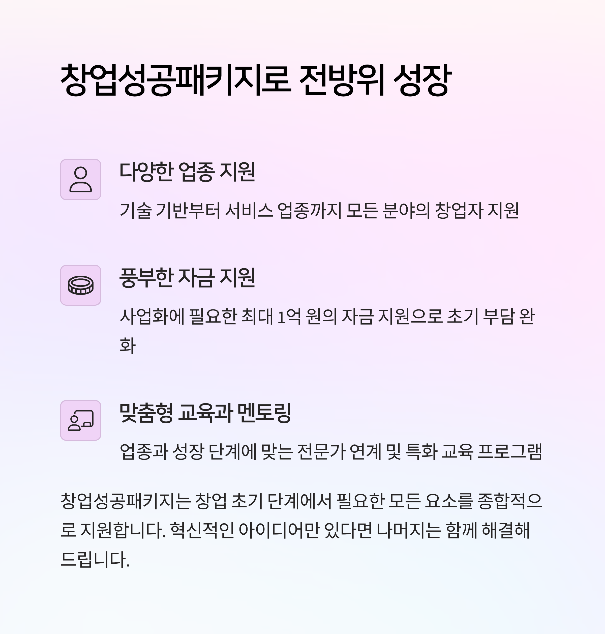 전문가와 함께 창업 여정을 단계별로 나눠서 진행하고 싶다면, 창업성공패키지가 좋은 출발점이 될 수 있어요!