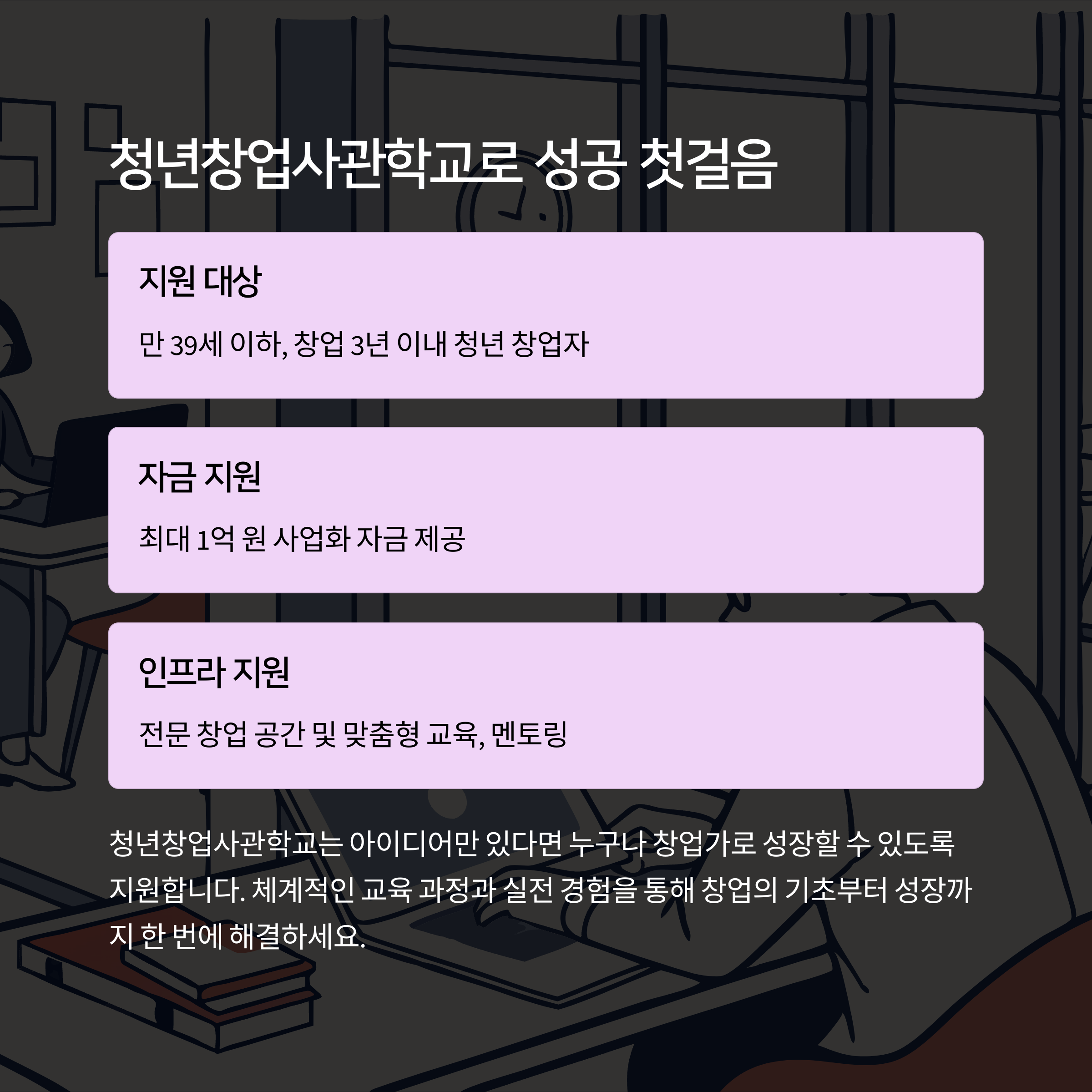 | 청년창업사관학교 | 창업 3년 이내 | 최대 1억 원 | 사업화 + 공간 + 교육 일괄 제공 |