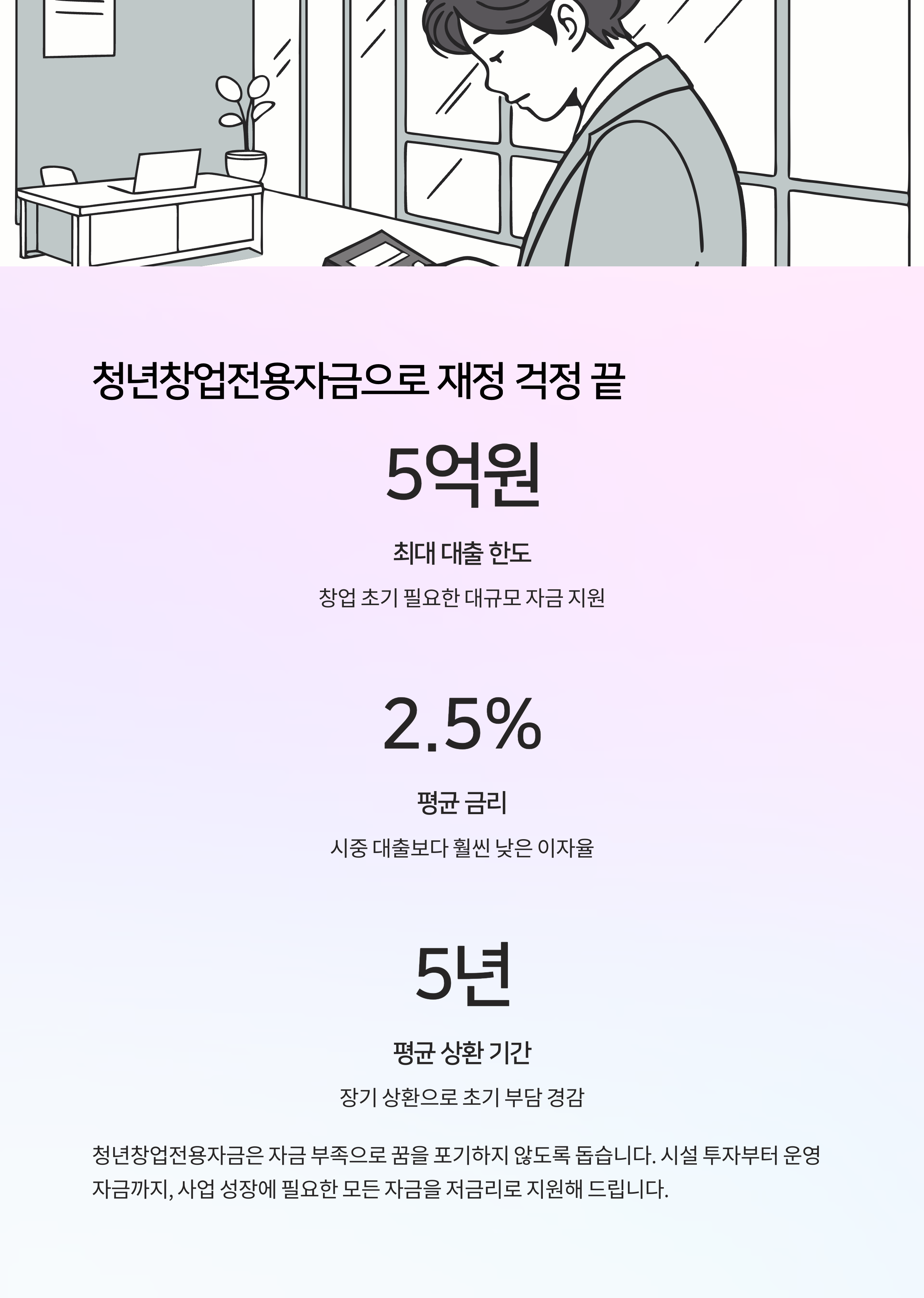 | 청년창업전용자금 | 청년 대표 기업 | 최대 5억 원 (대출) | 저금리 신용/담보 융자 |