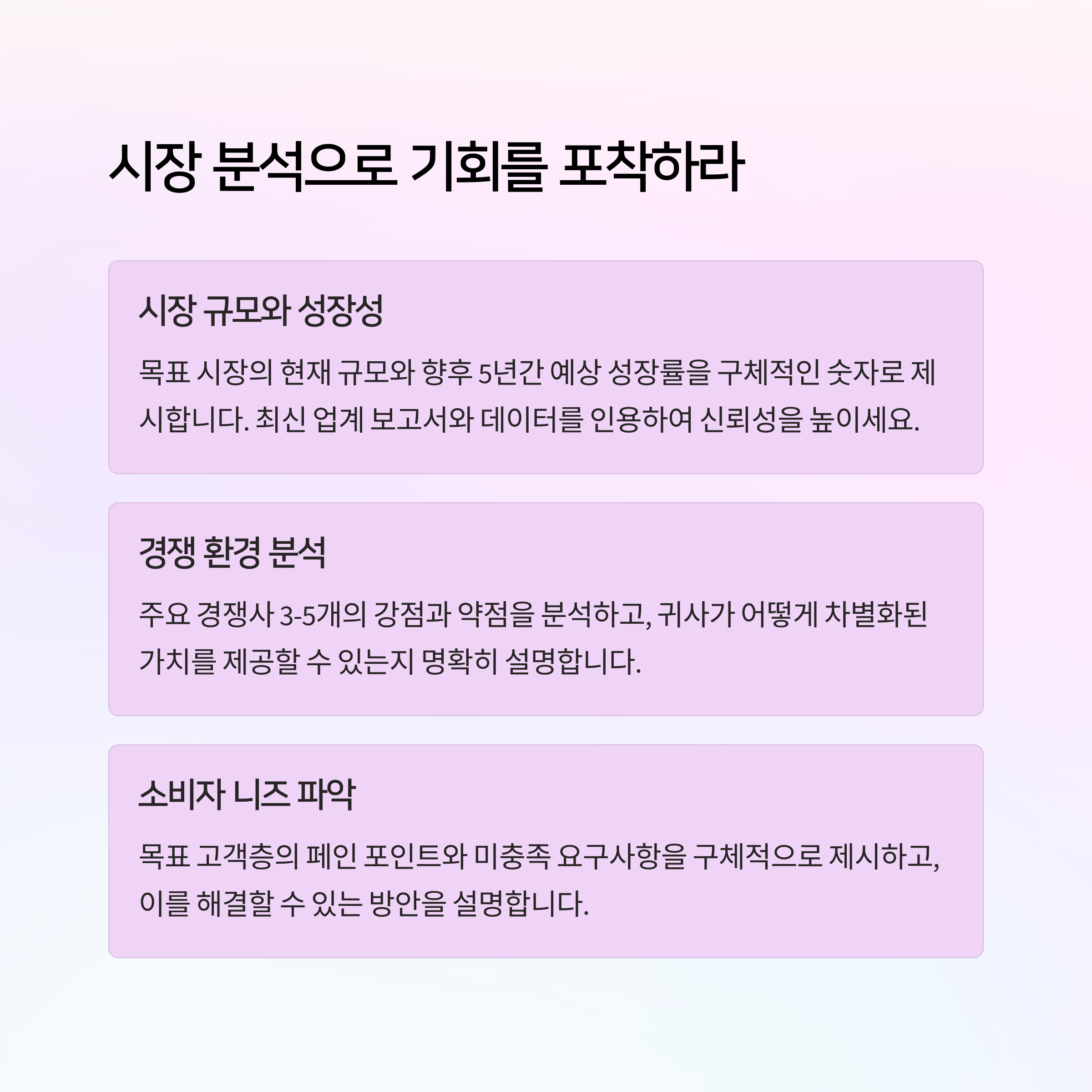 - 지나치게 이상적인 문구보다 실제 실행력과 시장 근거가 중요해요