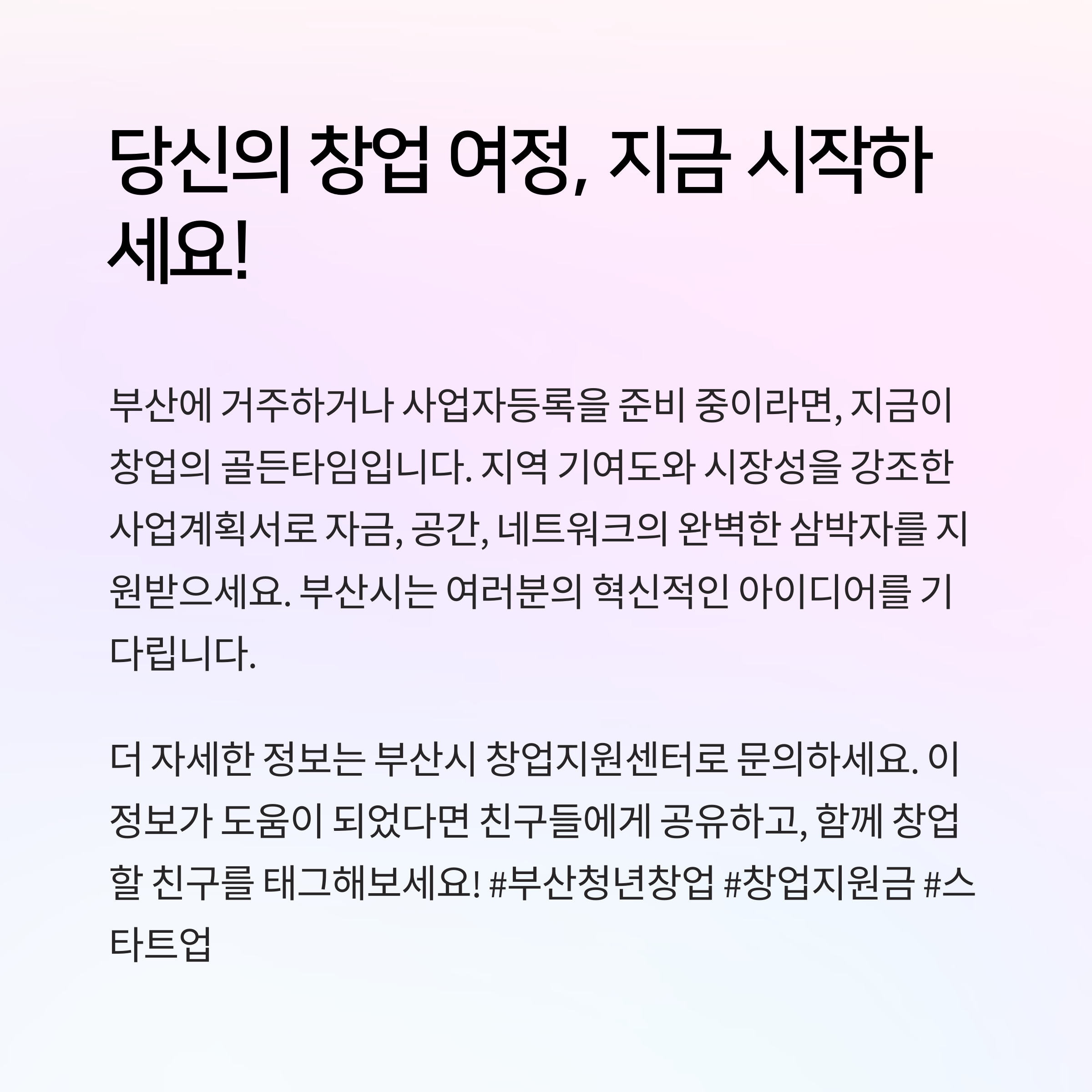 이번 편을 통해 부산에서도 창업 기회를 현실로 만들 수 있다는 희망을 얻으셨기를 바랍니다. 다음 편에서는 대구·경북 지역 창업 지원 제도로 이어갈게요!