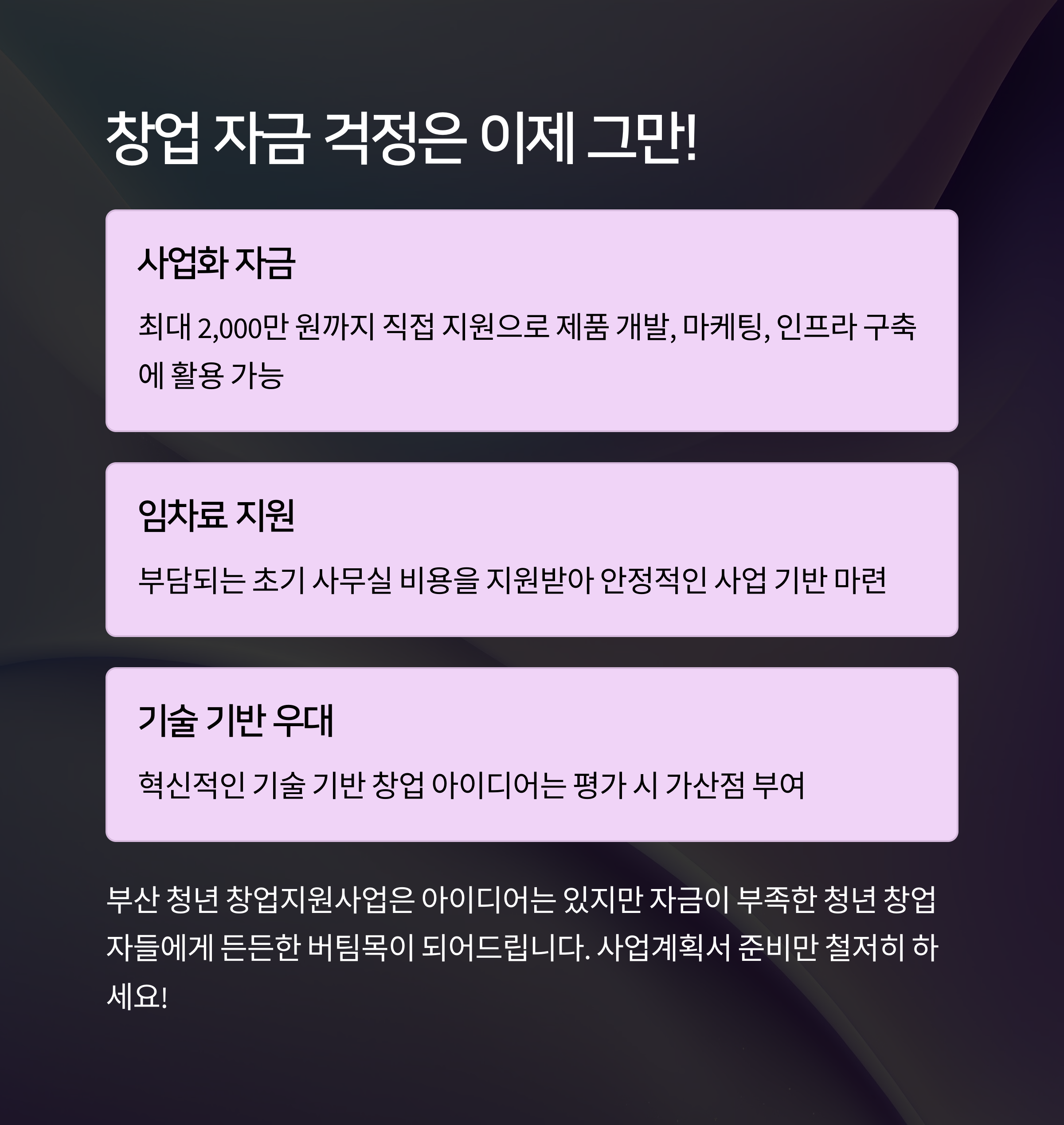 “부산에서도 청년 창업자가 꿈을 펼칠 수 있을까?” 답은 ‘YES!’입니다. 바다보다 넓은 가능성, 지금 시작하세요.