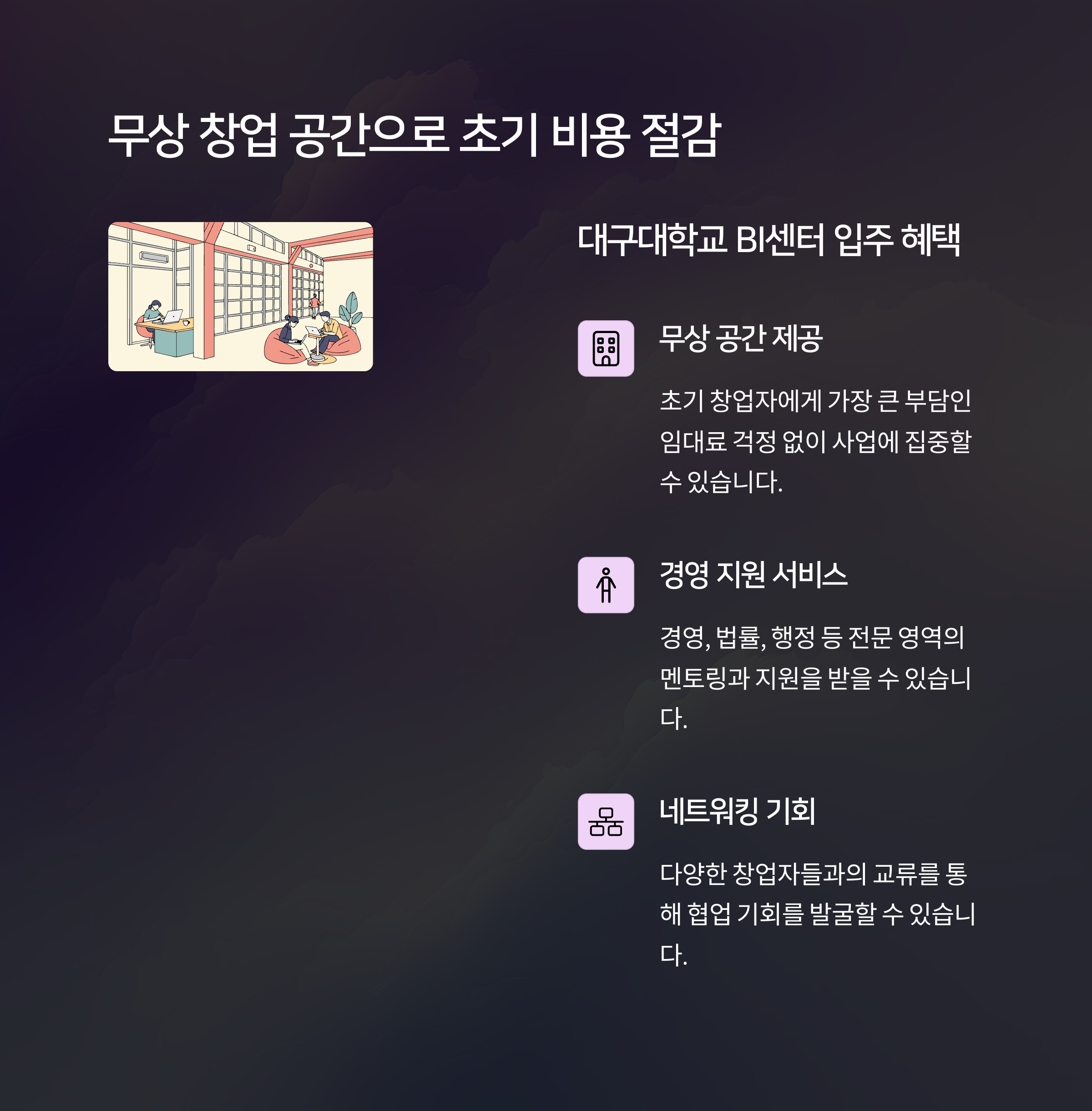 | 대구대 BI센터 입주 지원 | 예비 또는 초기 창업자 | 공간 + 경영 지원 | 사무공간 + 졸업기업 IR 지원 | 대구대학교 창업보육센터 |