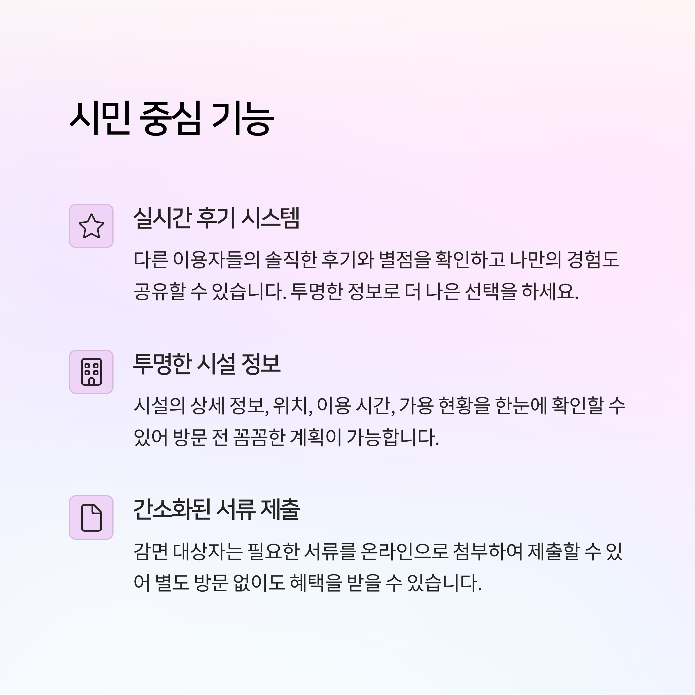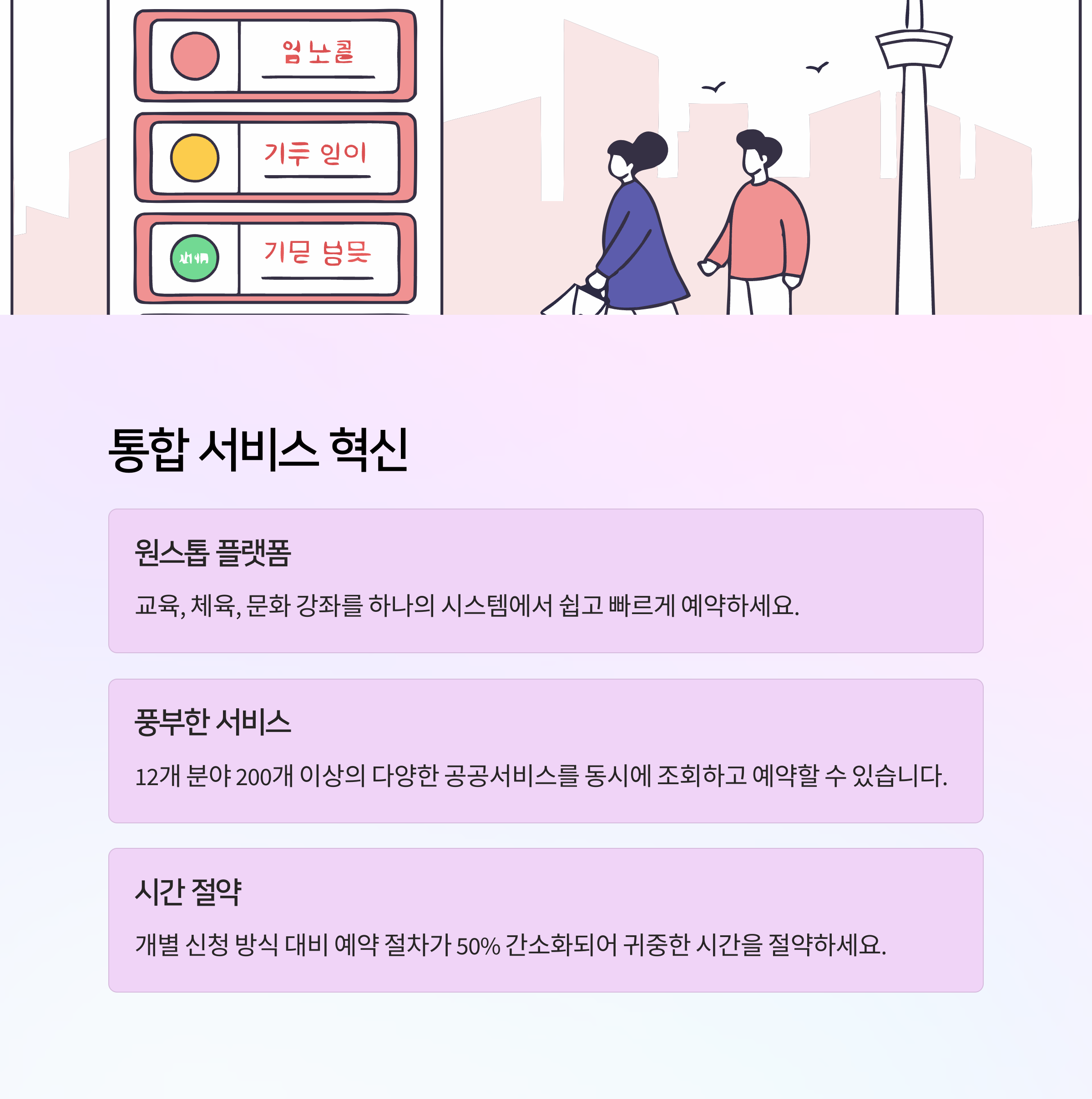 | 통합 로그인 | 하나의 아이디로 교육·체육·문화 시설 모두 예약 가능 |