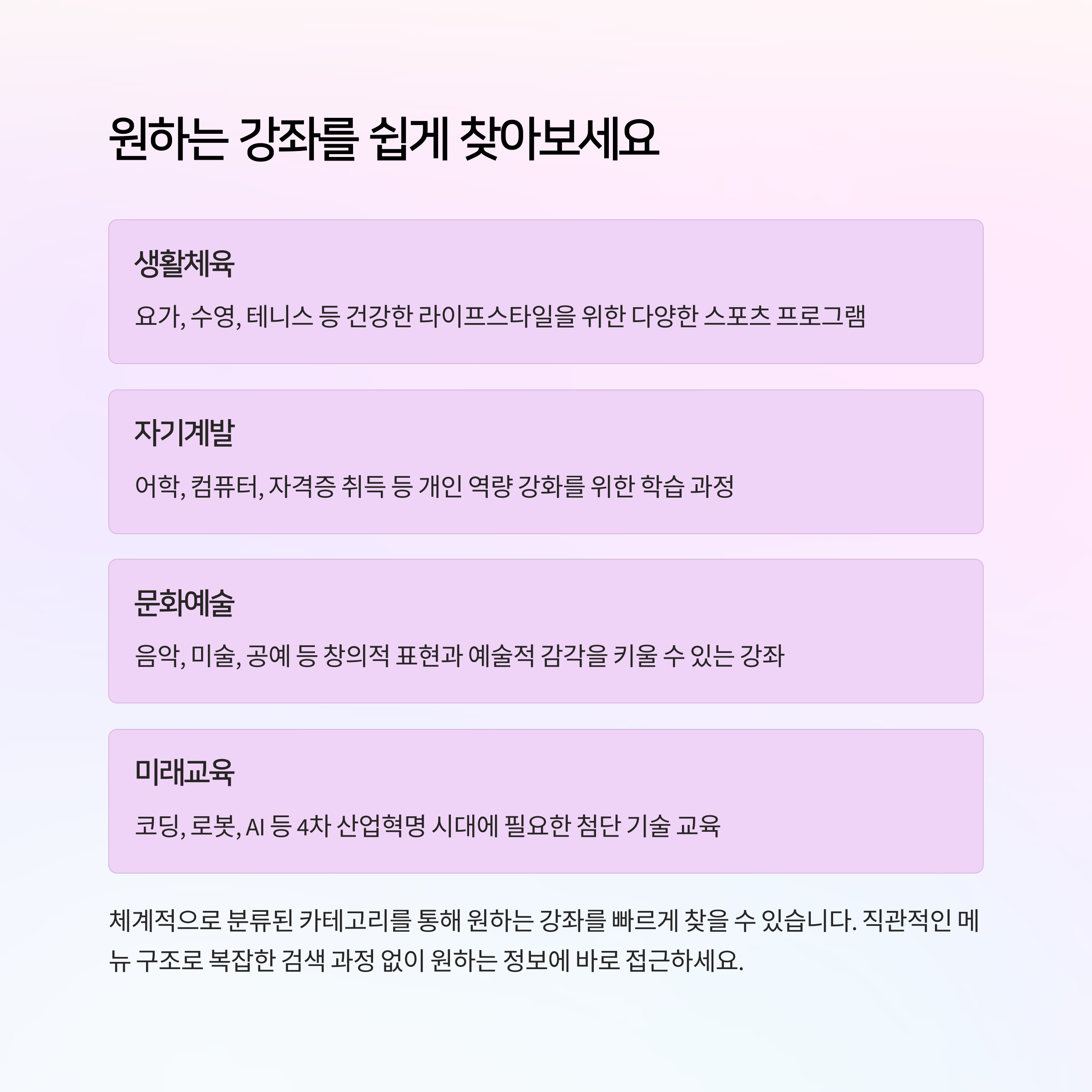 | 박○정 (분당구) | “카테고리 정리가 잘 돼 있어서 원하는 강좌 찾기 쉬웠어요. 주말에 부모님도 쉽게 신청하시더라고요.” |