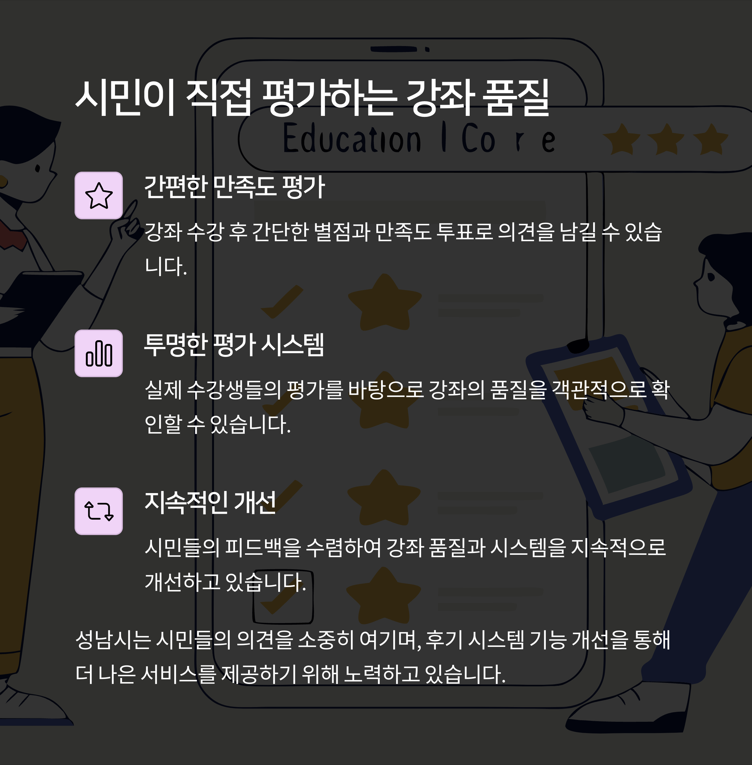 | 박○정 (분당구) | “카테고리 정리가 잘 돼 있어서 원하는 강좌 찾기 쉬웠어요. 주말에 부모님도 쉽게 신청하시더라고요.” |