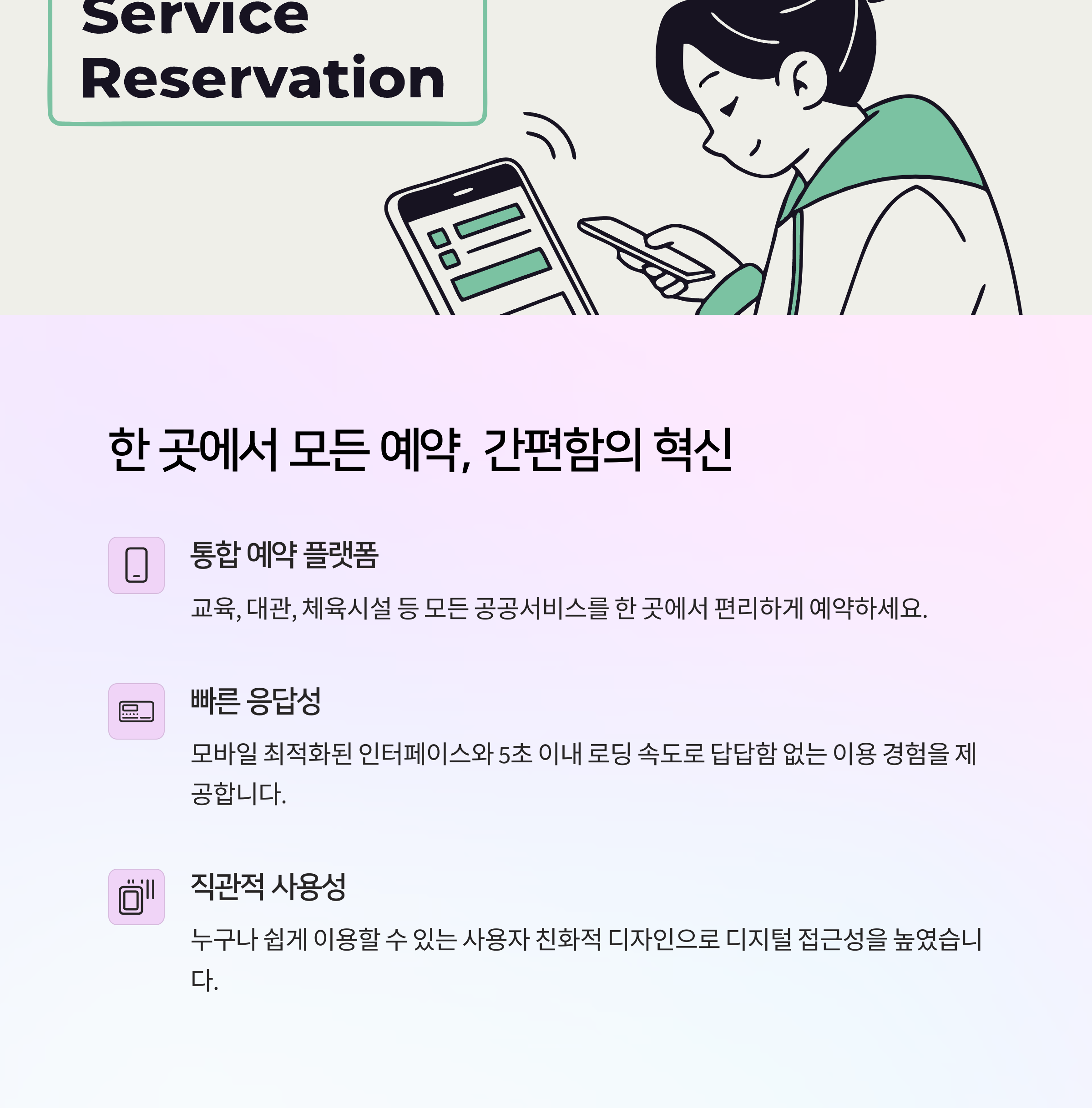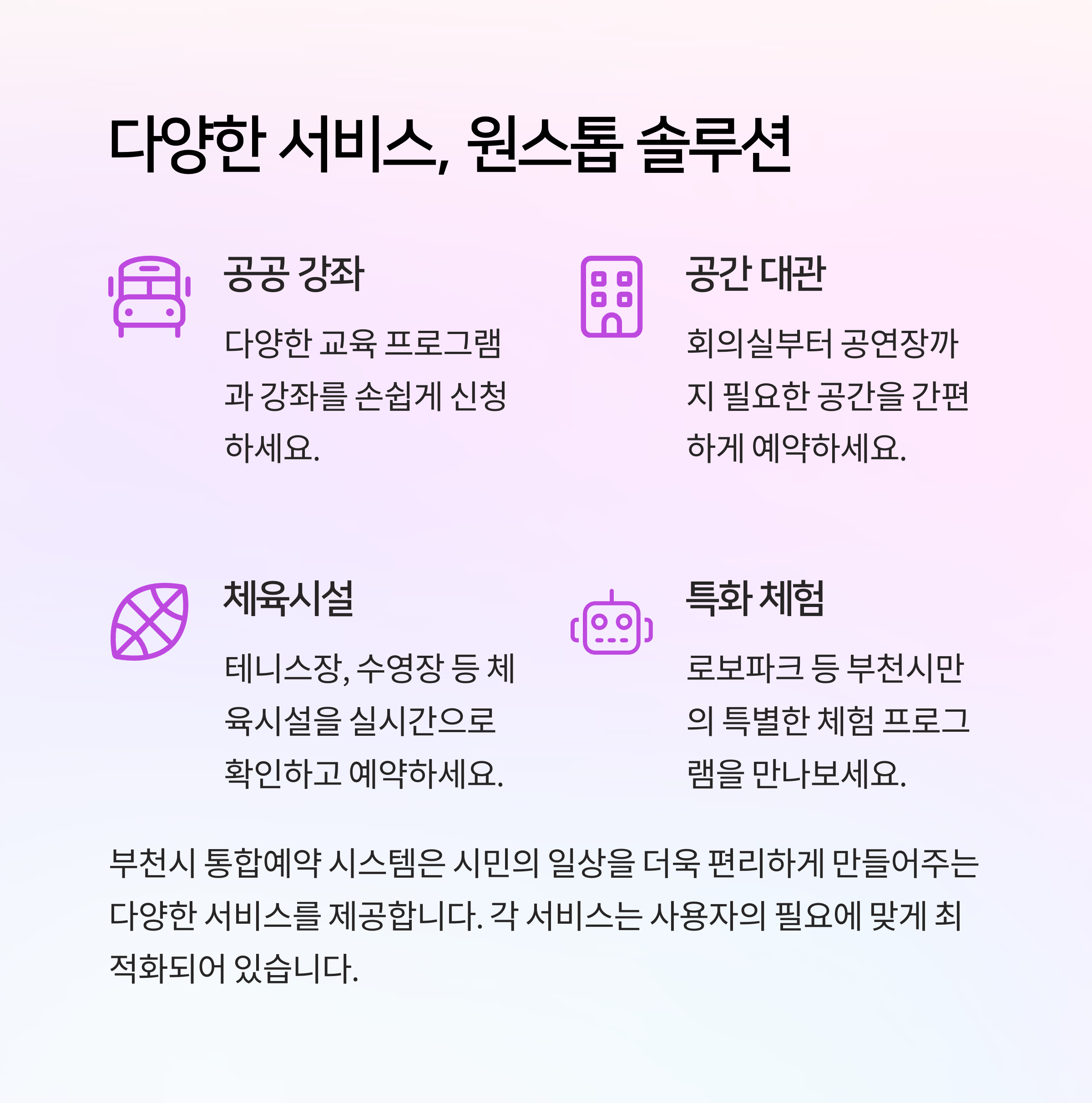 | 체육시설 | 테니스장, 족구장, 풋살장 등 공공 체육 공간 예약 |