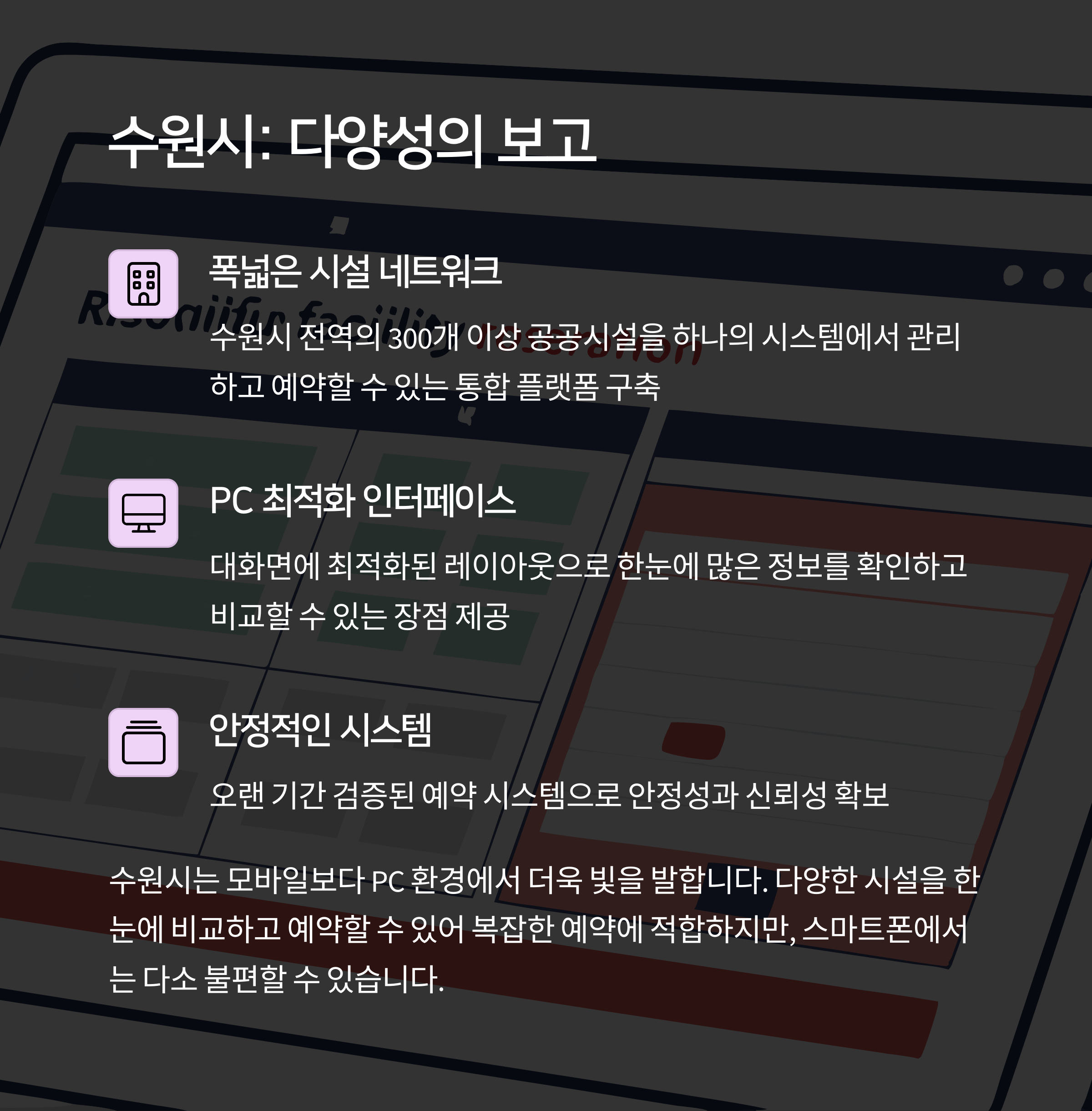 | 수원시 | 다양한 시설 통합예약 | ★★★☆☆ | ★★★☆☆ | ★★★★☆ |