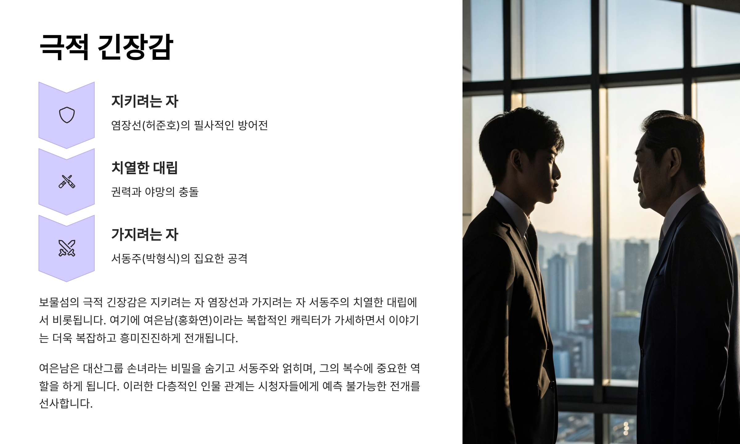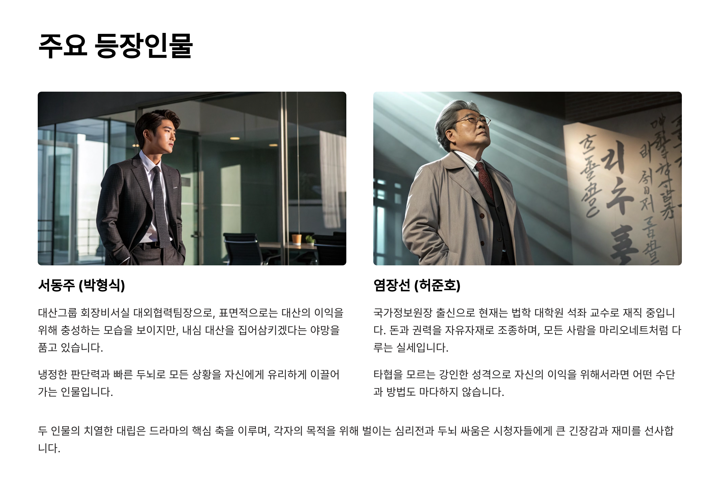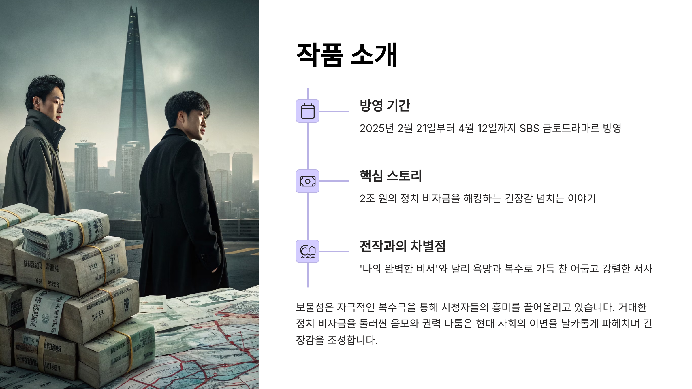 | “서동주의 복수극이 손에 땀을 쥐게 한다.” | 몰입감 최고, 심리전이 흥미로움 |