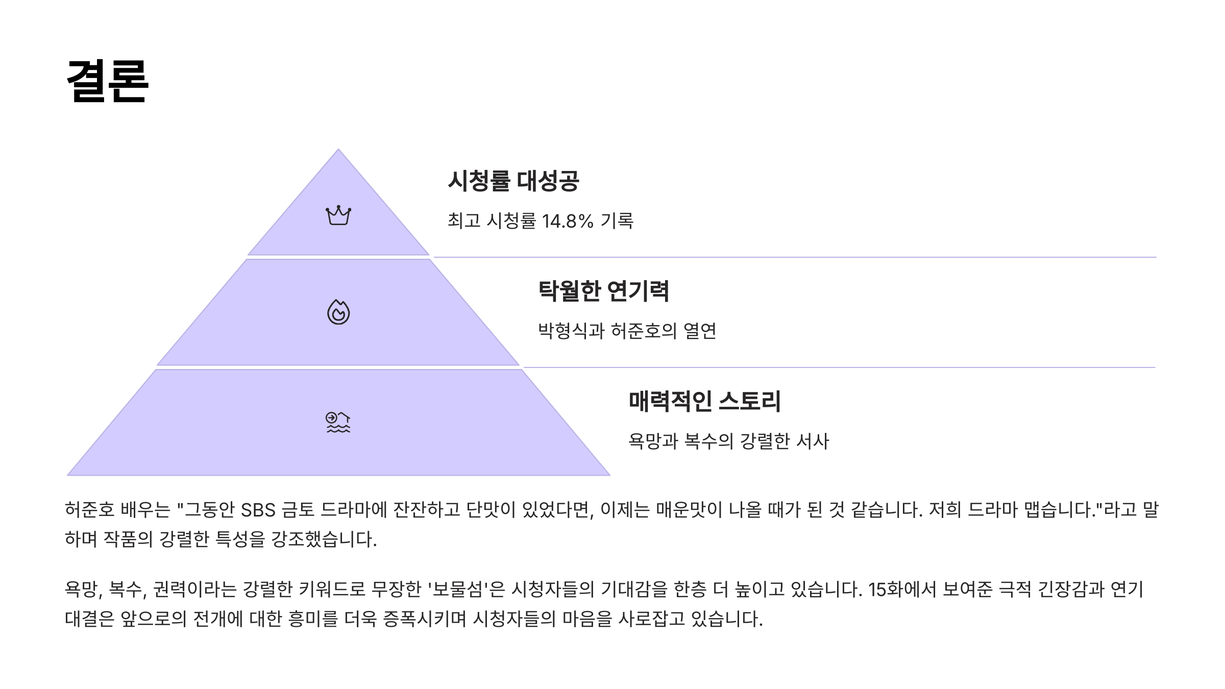 이제 보물섬도 끝을 향해 달려가고 있네요. 솔직히 말하면, 이렇게까지 몰입하게 될 줄 몰랐어요. 복수극이라는 익숙한 틀 안에서, 이토록 섬세하게 감정선을 그려낸 드라마는 오랜만입니다. 특히 박형식과 허준호의 대결은 단순한 선악 구도를 넘어서서 인간 본성에 대한 깊은 질문을 던지는 듯했죠. 다음 화에서는 어떤 반전이 기다리고 있을까요? 여러분은 어떤 장면이 가장 인상 깊었나요? 댓글로 함께 나눠봐요!