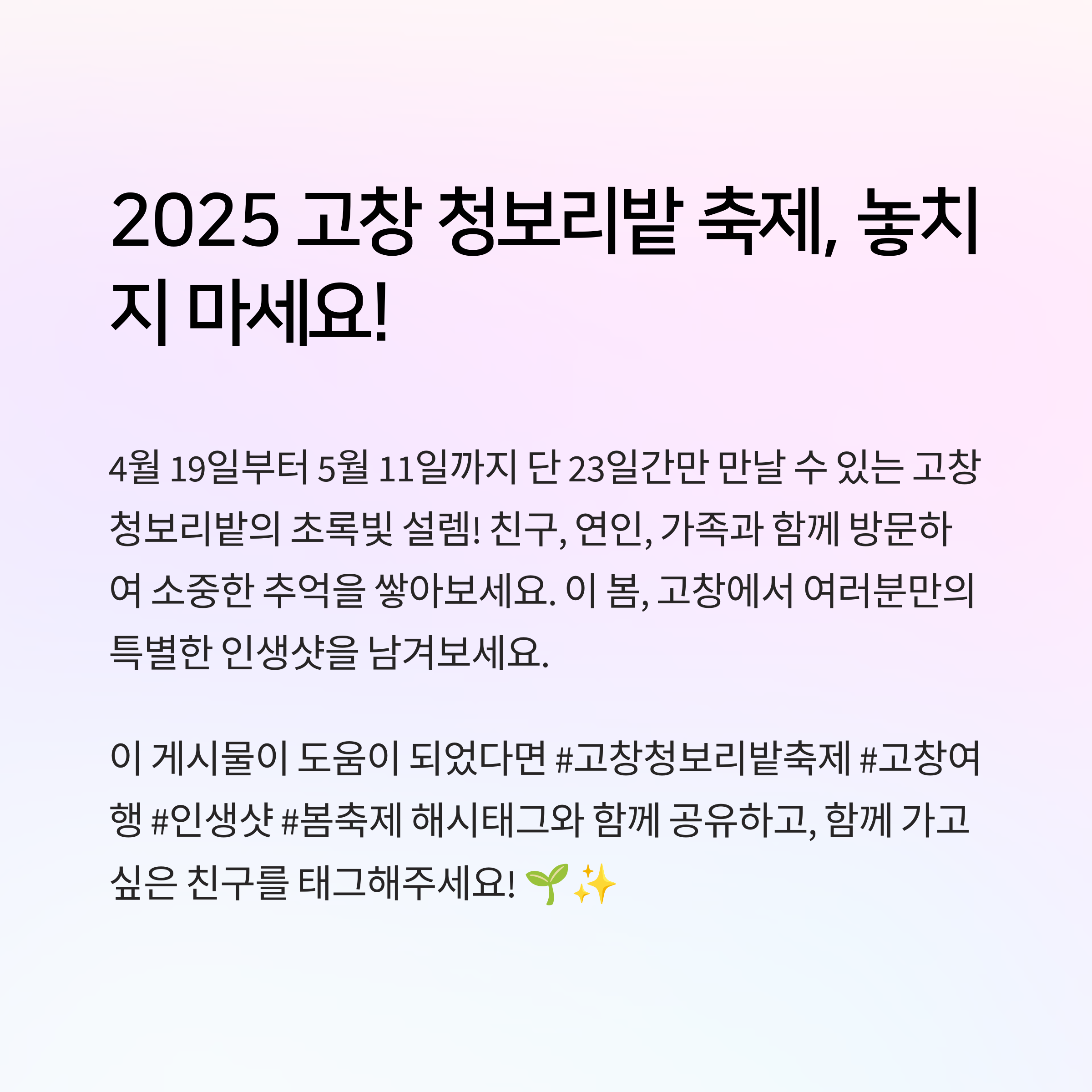 지금 아니면 또 1년을 기다려야 하잖아요! 날씨 좋은 봄날, 사랑하는 사람들과 함께 초록 물결 속 추억 한 페이지, 고창에서 만들어보세요. 이 글이 도움이 되셨다면 저장과 공유도 부탁드려요 🌾