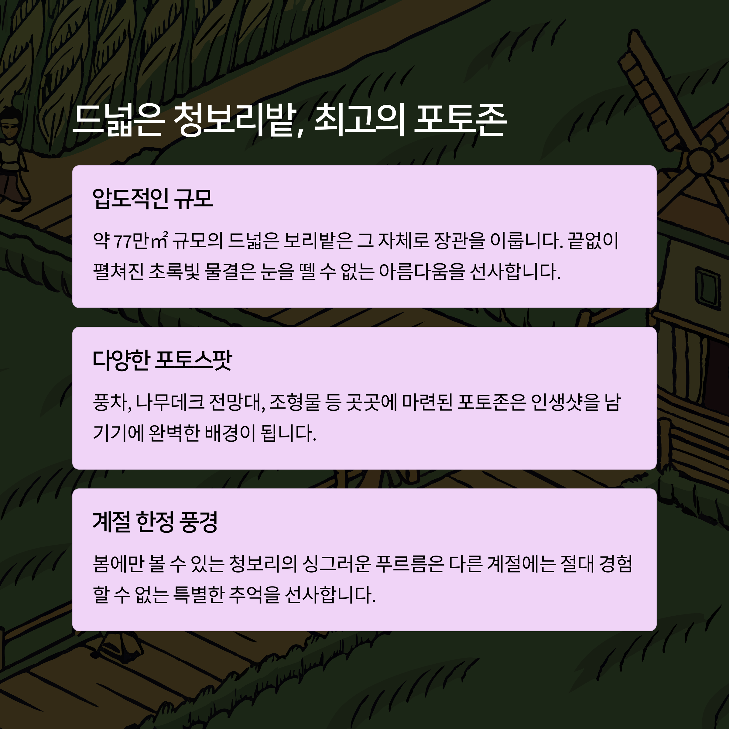'폭싹 속았수다' 드라마의 여러 장면이 청보리밭 내 주요 포토존에서 촬영되었어요. 풍차 포토존과 전망대가 특히 유명하니 꼭 들러보세요.